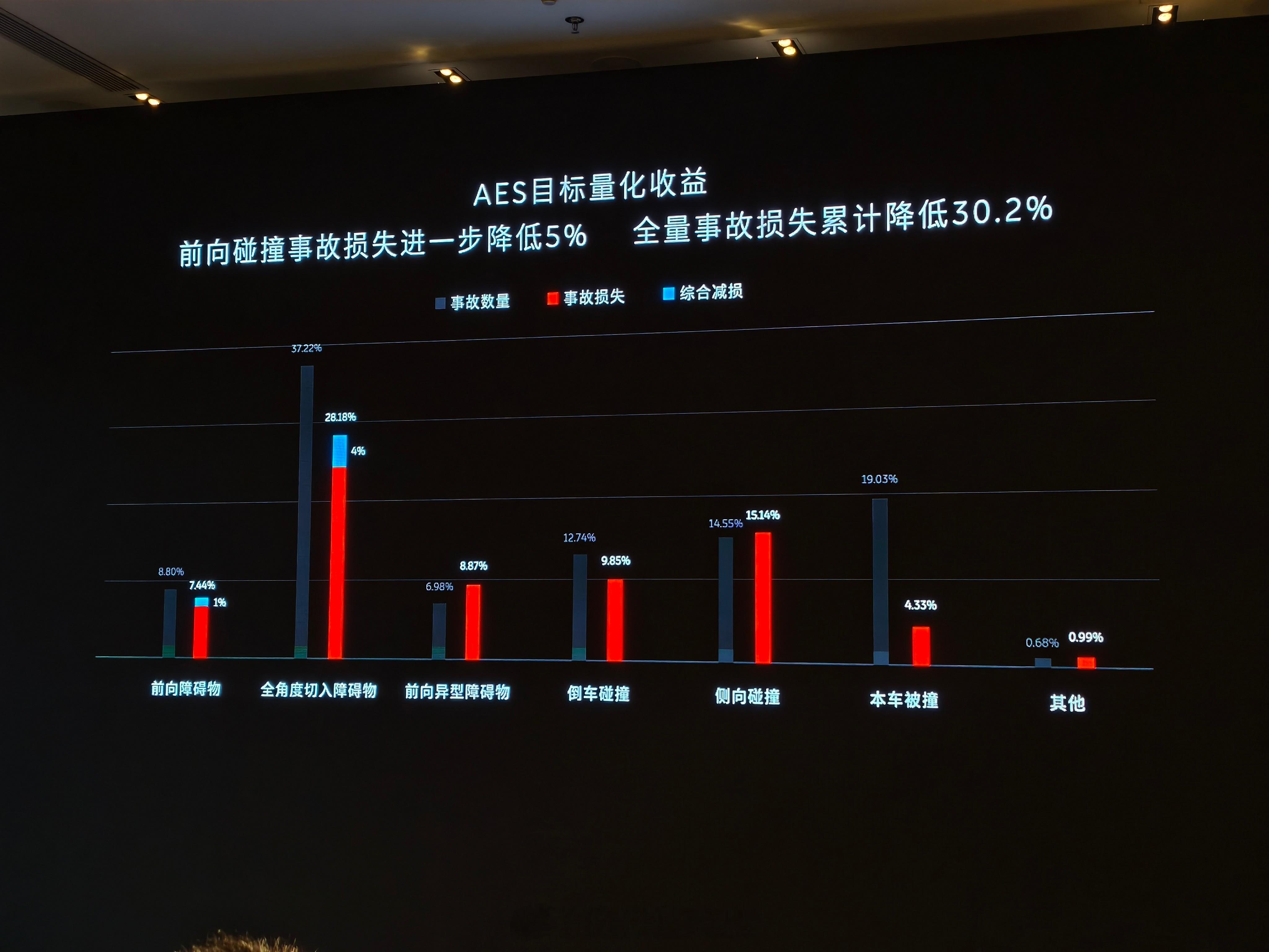 在AES全量推送之后,前向碰撞事故的减损会继续提高,进一步降低5%,之前是15.22%,AES应用之后预估会到8.22%,全量事故减损累计降低30.2%