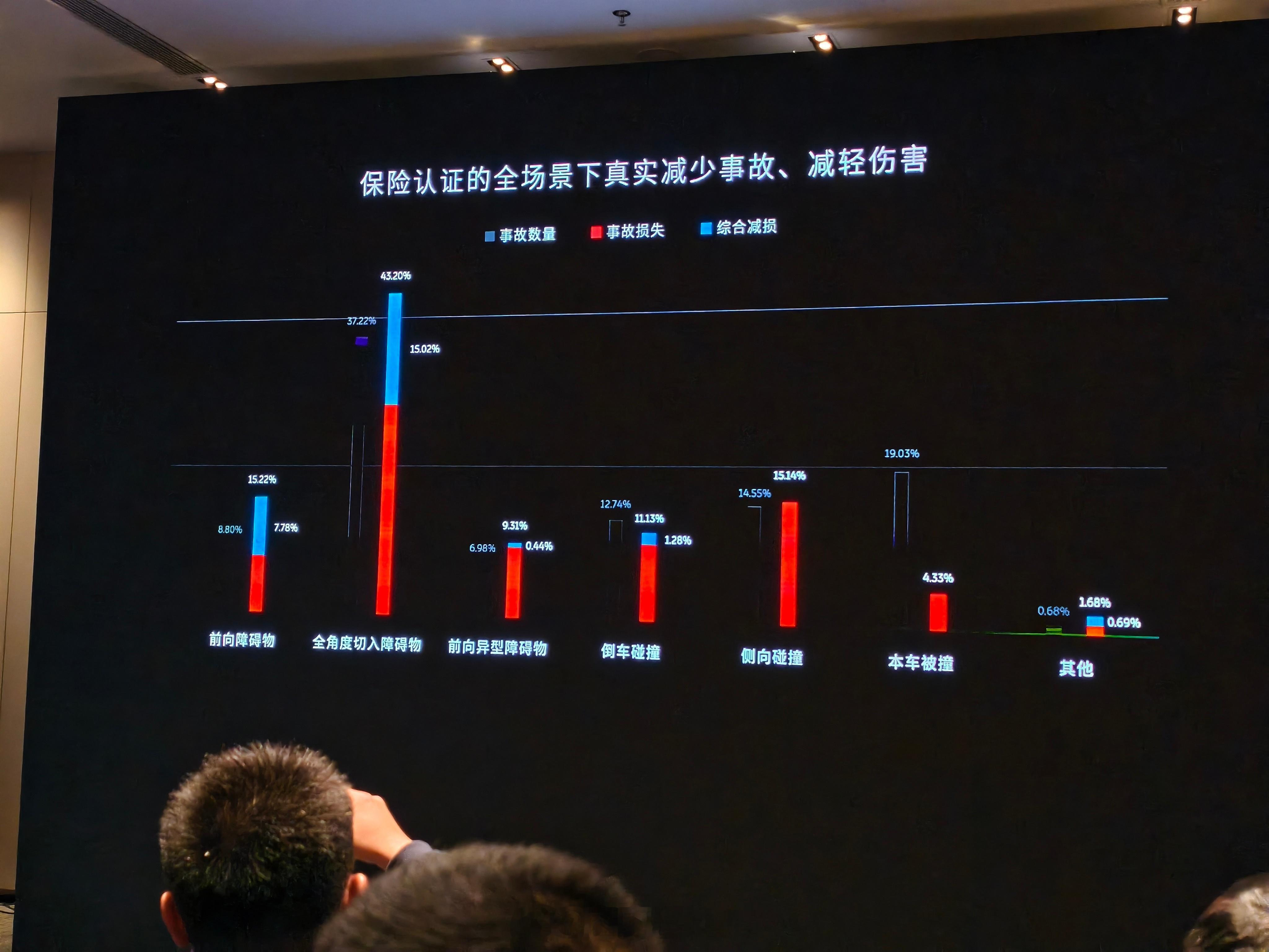 在安全辅助系统的加持下,全角度切入障碍物事故综合减损15.02%;前向障碍物事故减损7.78%;侧向碰撞事故减损1.28%