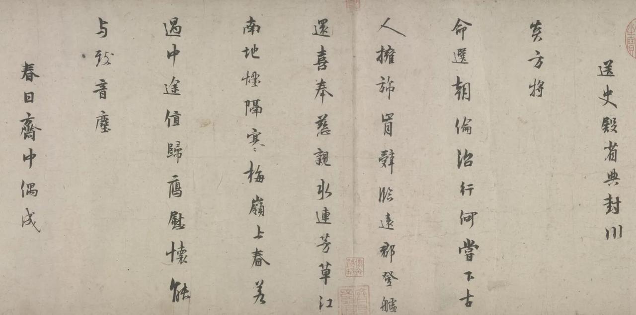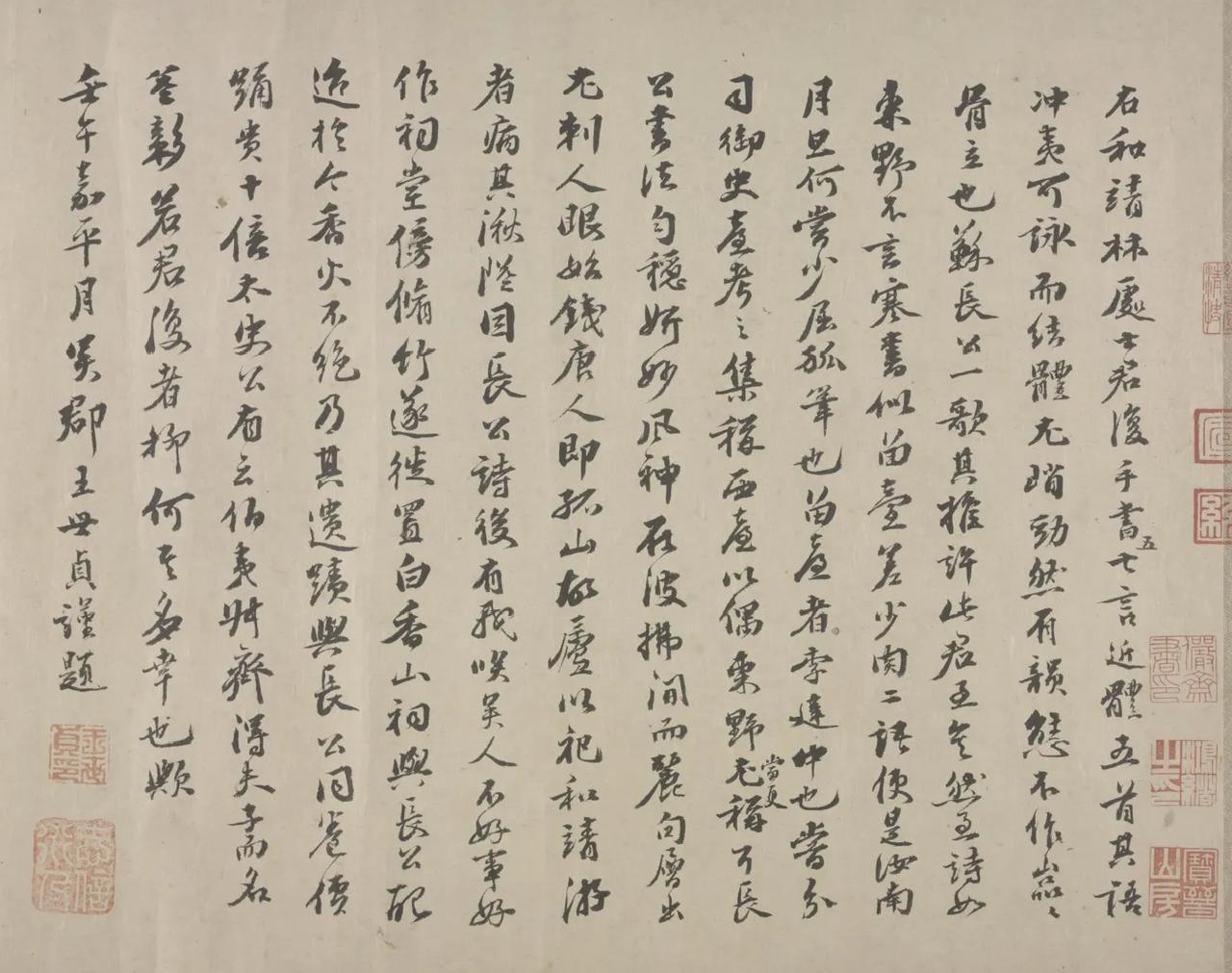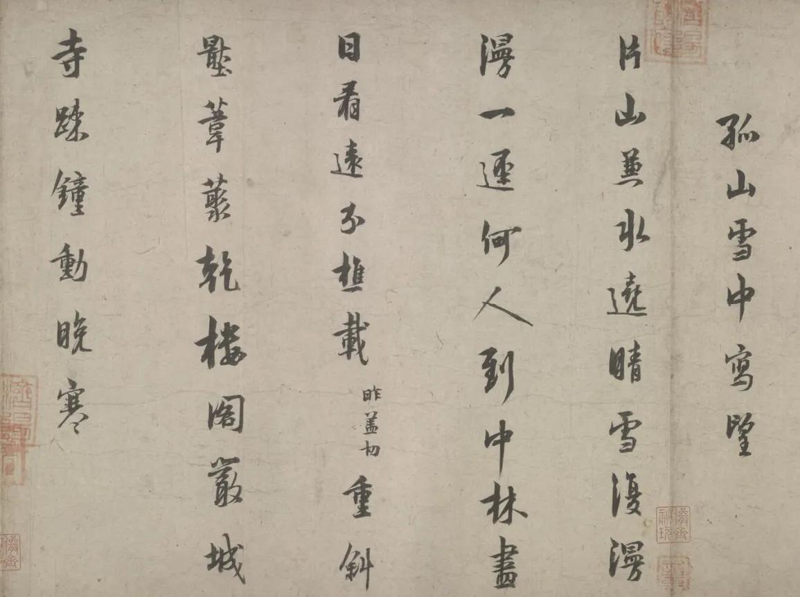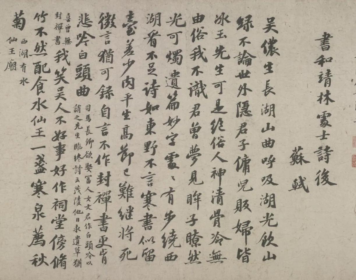 浙江博物馆正在展出宋代大隐士林逋的《行书自书诗卷》,全长三米多,收录了林逋的五首诗,两首五言诗,三首七言诗。这是难得的林逋的手迹啊。最重要的还有苏轼题的一首诗,明代王世贞题诗。乾隆皇帝把所有的空间都占满了,又接了一张纸,写了好几首诗。这是一件难得的珍品。