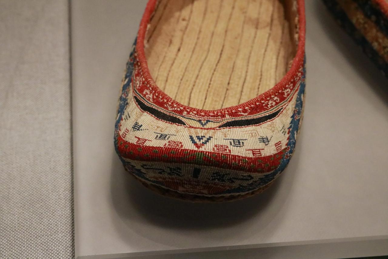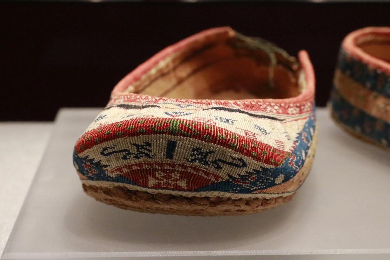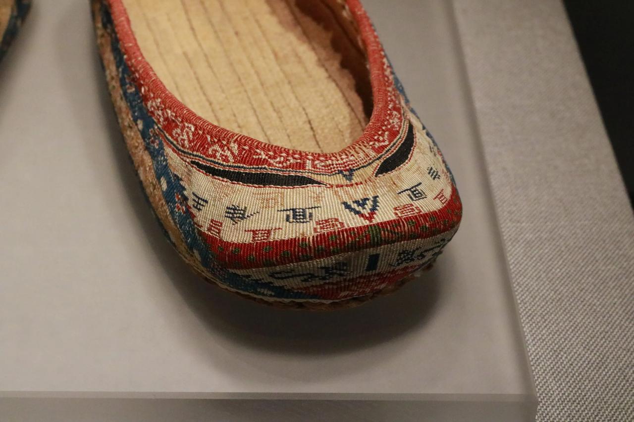 看看这双鞋的主人有多少美好愿望,履面用彩丝,帮、底、里用麻绳编织,履面使用褐色、红色、白色、黑色、蓝色、黄色、金黄、绿色八种颜色,织成云纹和各种花纹。帮面织“富且昌,宜侯王,天延命长”10个隶书汉字。这位主人不仅希望富贵、昌盛,还希望作侯作王,还希望长命百岁。这是藏于新疆维吾尔自治区博物馆的东晋时期的织成履。拍摄于宁波博物馆&