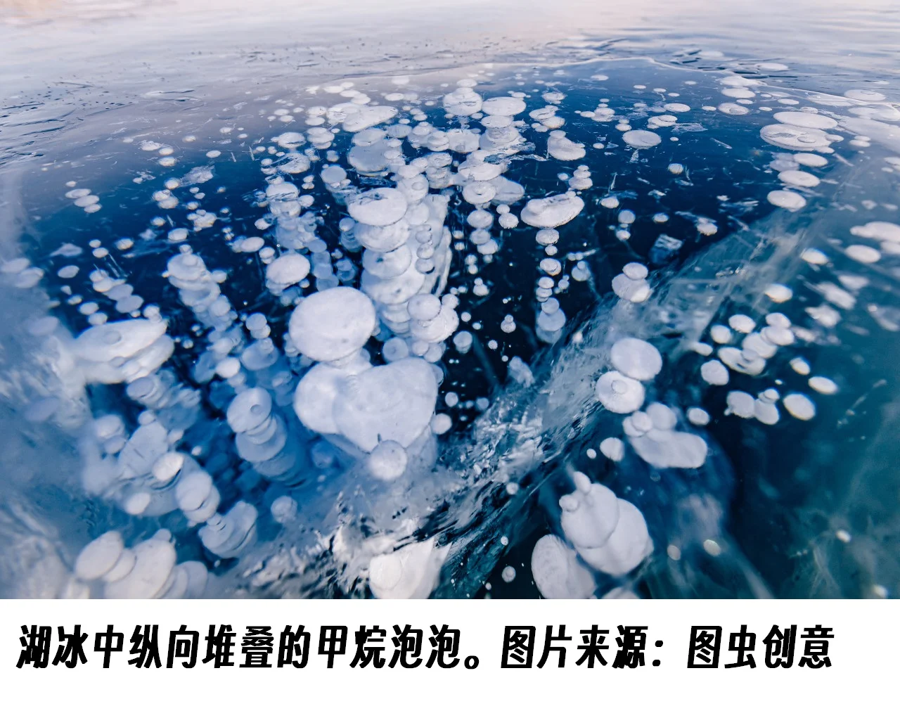在冬天湖面冻结之后,上浮的甲烷气泡被冰层挡住无法跑掉,然后又被冻在了原地。随着冰层越冻越厚,其中冻结的甲烷泡泡也会纵向堆叠起来,形成奇妙的冰泡景象。在世界各地寒冷地区的湖泊中,都能找到这种甲烷气泡的身影。