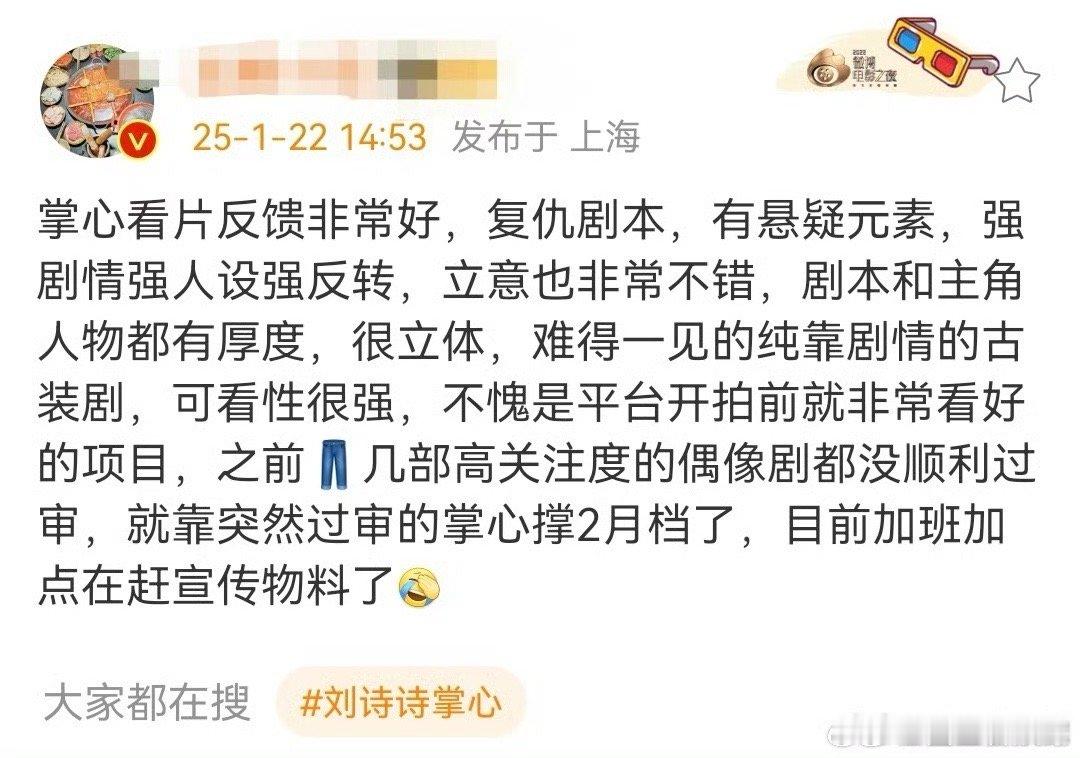 电视剧掌心[超话] 掌心看片反馈 掌心超好看,细节伏笔精彩,女主高智。这样的好剧不容错过!