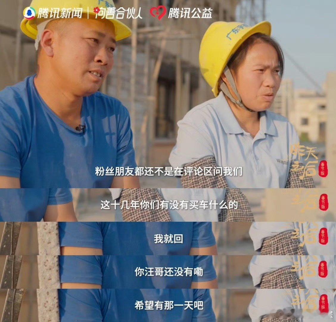 春晚农民工夫妇14年后仍买不起车 时光飞逝14年,汪正年夫妇依旧无车。但他们用坚强和爱迎来家庭的团圆,曾经的苦都化作了甜。