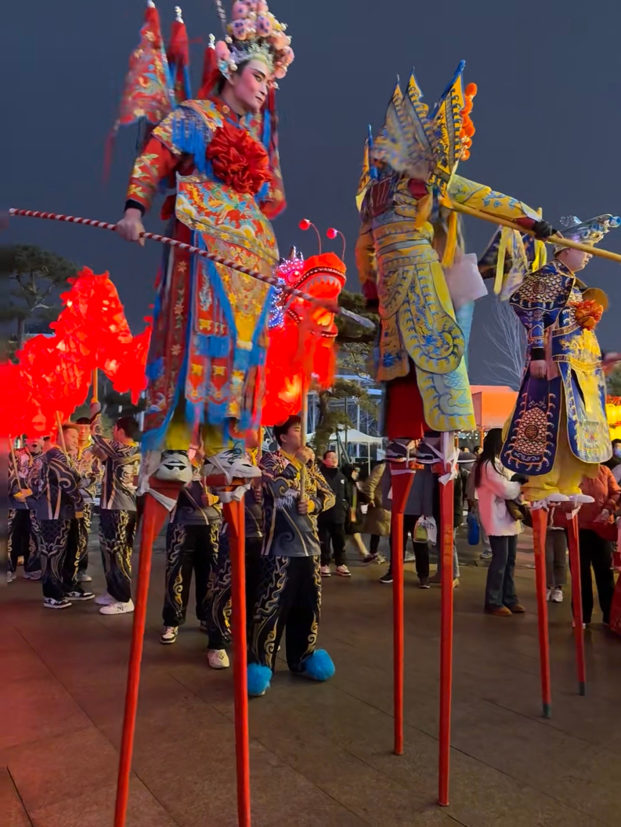 春节期间,西安各处的热闹场景让人应接不暇。民乐园步行街摇身一变,成为了传统民俗的大舞台。社火表演、民俗演出与花灯展示纷纷登场,热闹非凡。舞龙舞狮的队伍上下翻腾,身姿矫健;踩高跷的艺人步伐轻盈,惊险又刺激;扭秧歌的人们身着艳丽服饰,舞动着彩绸,脸上洋溢着幸福的笑容。每一个表演都带着浓浓的年味,让游客瞬间沉浸在热闹的节日氛围中,感受着传统文化的独特魅力。