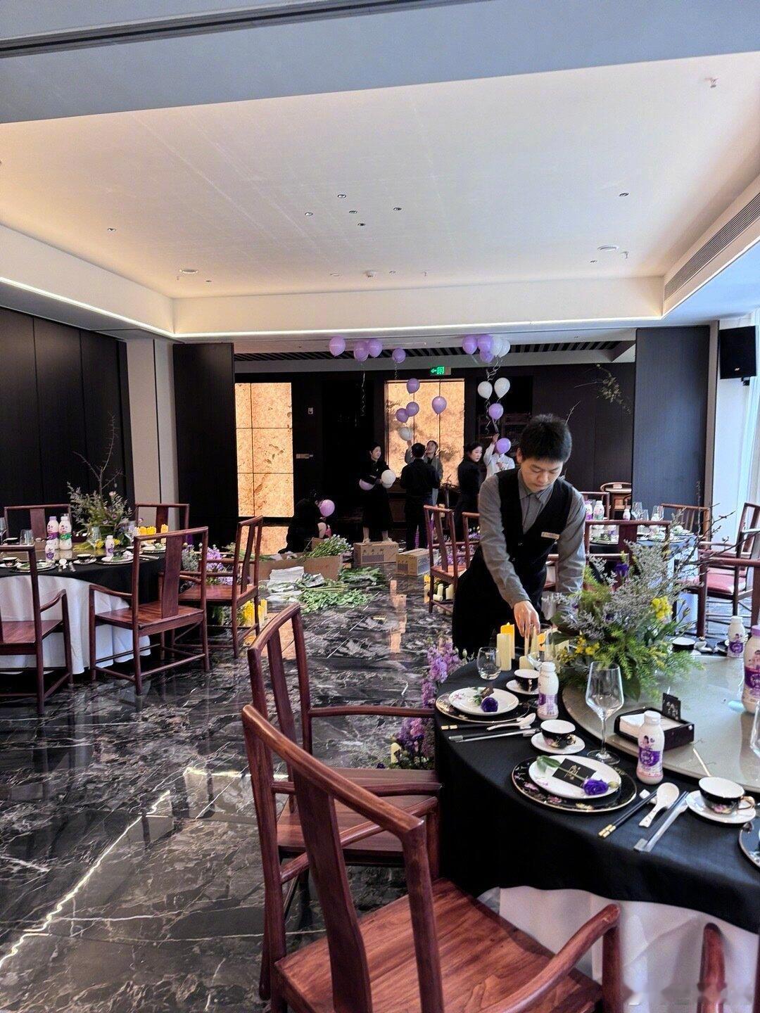 赵露思请粉丝吃饭的布置 这个餐厅和喜宴有什么区别,还放了紫色的气球和紫色的装饰花,我也要去我也要和赵露思结婚[抓狂]