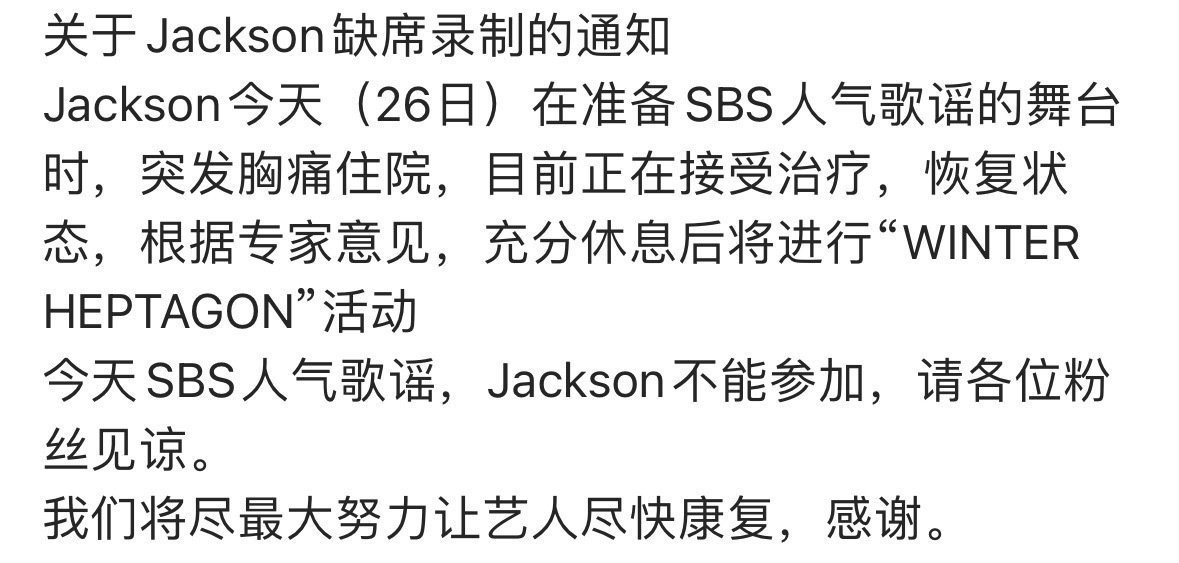 王嘉尔突发胸痛住院缺席今日SBS《人气歌谣》录制,希望尽快康复呀,一定注意身体[跪了]