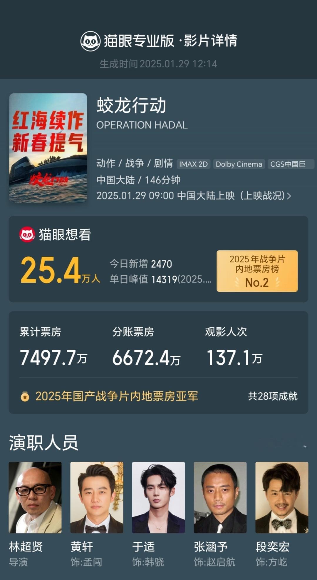 黄轩[超话] 黄轩工作室连包9场支持蛟龙行动 据猫眼专业版云包场显示,连包9场支持电影《蛟龙行动》,截至当前影片总票房已超7497.7万,大年初一正在热映中!