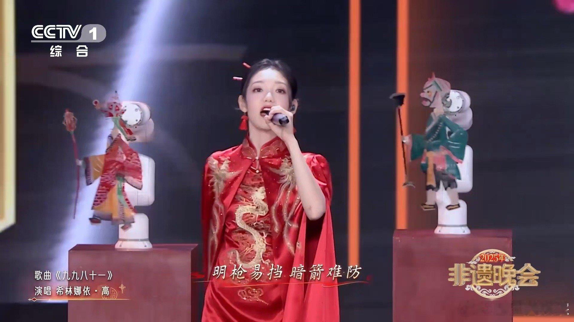希林娜依高的嗓音与这三项非遗太搭了 非遗晚会因希林娜依高的嗓音而闪耀。她用歌声为皮影、京剧、剪纸注入活力,皮影孙悟空大闹天宫在她的歌声中更加惊险刺激,三项非遗也因此更具吸引力。