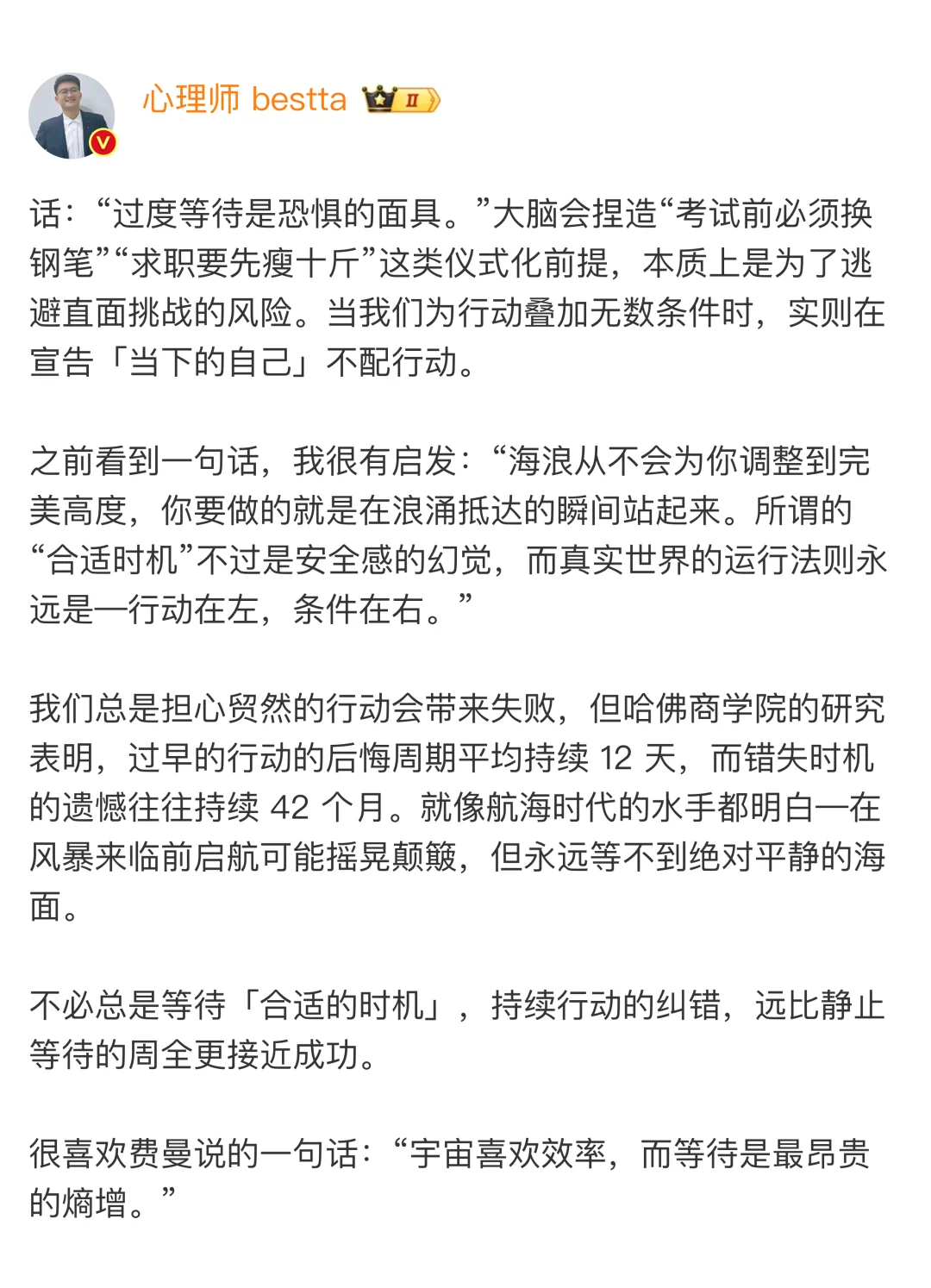 之前有看到:“开始行动总比等待最优选择要好,所以实际上正确的决策是次优的”