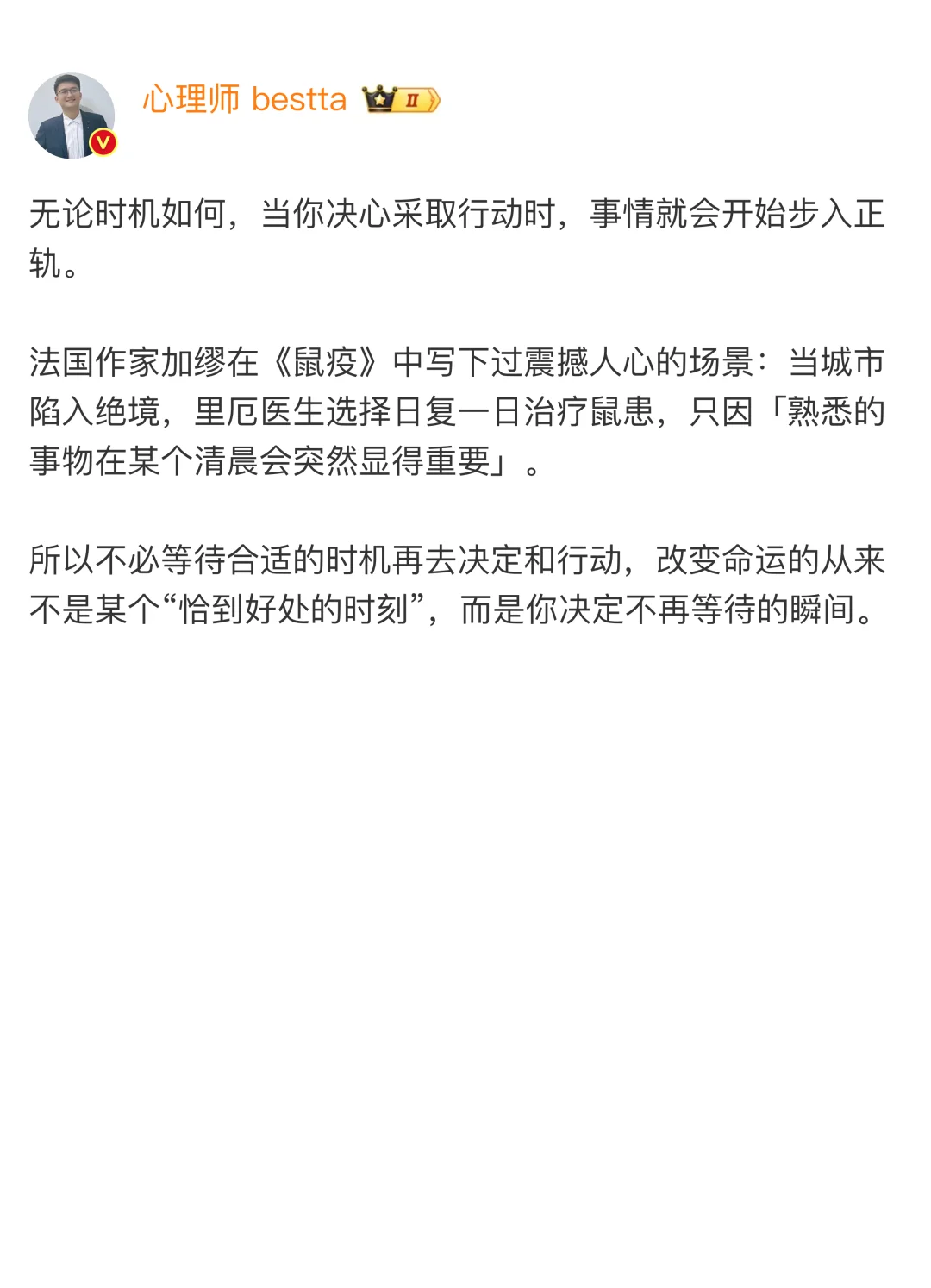 所以不必等待合适的时机再去决定和行动,改变命运的从来不是某个“恰到好处的时刻”,而是你决定不再等待的瞬间。
