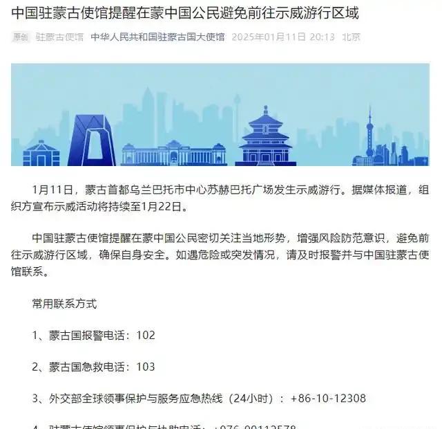 若国际社会不及时伸出援手,蒙古国的困境恐将进一步恶化。当前的动荡仅是冰山一角,未来可能面临更多严峻挑战。蒙古国亟需外部援助,以摆脱困境,实现可持续发展。否则,这个曾被视为“最安全”的国家,或将陷入更深的泥潭。中国大使馆已发布提醒,关注蒙古国局势变化。