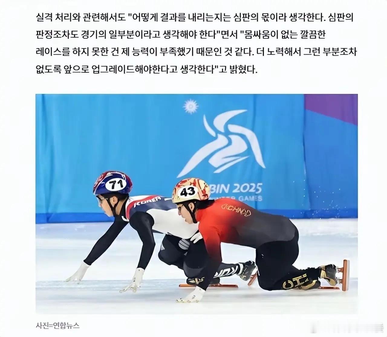 韩国队虽然成绩无效,但他们赛后却有说有笑,可能在他们看来,只要林孝埈被整倒,他们的目的就实现了,自己能不能拿冠军反而不重要了!赛后,朴知元回应判罚时还为自己故意犯规进行辩解,他竟然表示之所以有肢体接触,是“因为我的能力不足”,但他仍觉得“非常有趣”,因为这样做有流量“只有我们展开激烈争夺,粉丝才会看得更有意思”。