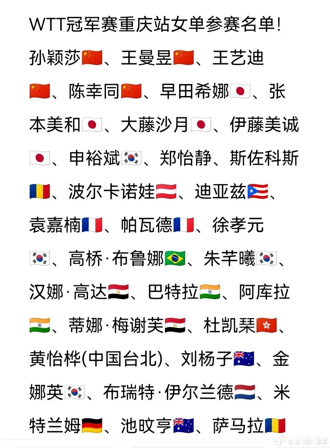 2月12日,WTT公布了重庆冠军赛参赛名单,男女各30人。冠军赛邀请世界排名前32的选手参加,冠军有1000积分,在WTT系列赛事中仅次于大满贯(2000分)、年终总决赛(1500分)。