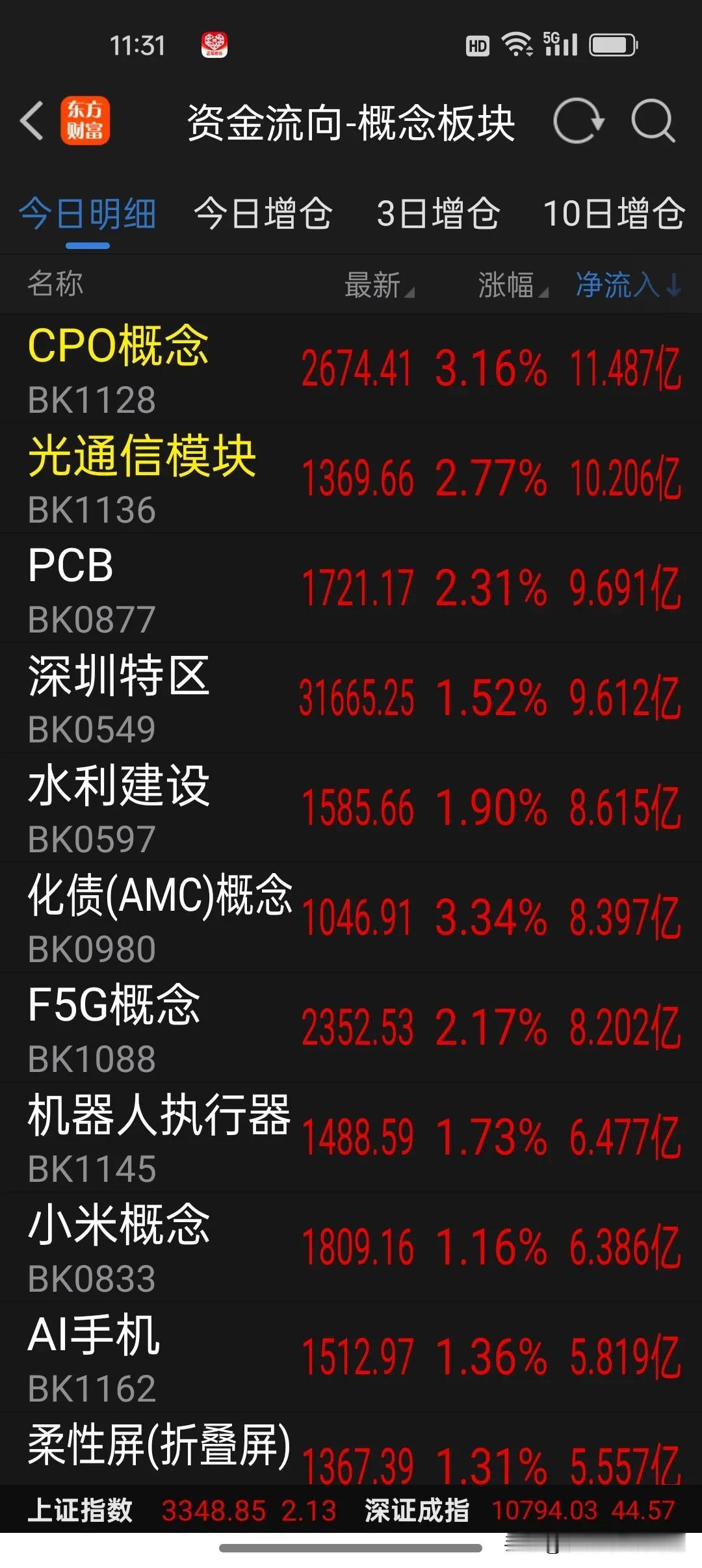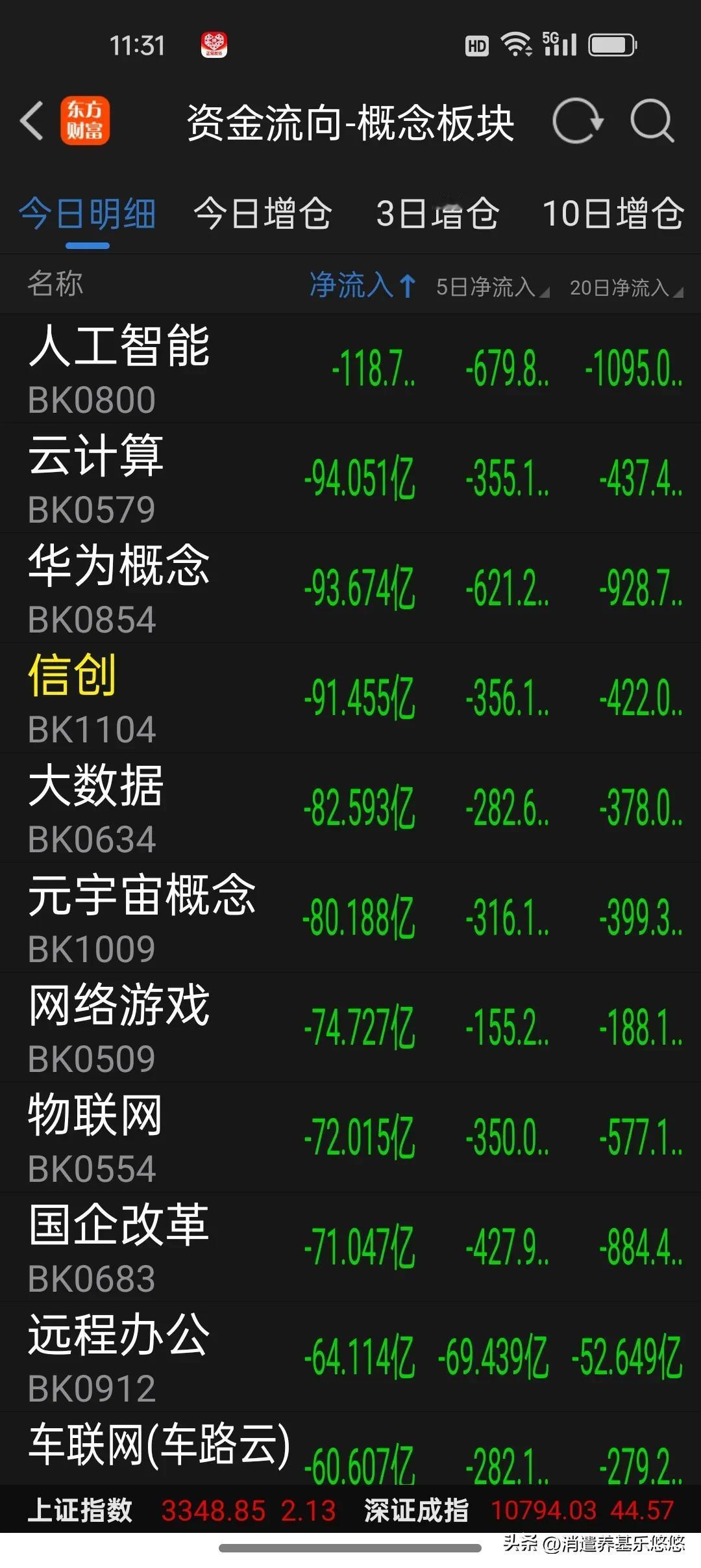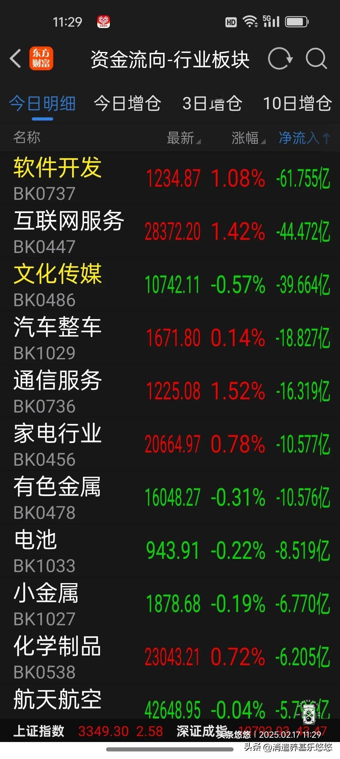 17日午间看盘及资金流向 今天上午大盘冲高回落,1两市成交额超1.25万亿元,比昨天放量2300亿元,主力资金流出225亿元,个股涨多跌少,涨停个股101个。 盘面上,教育,医疗服务与器械1,游戏,船舶制造,仪表仪器等板块涨幅居前。 贵金属,能源金属,有色金属,电池,航空机场,文化传媒等板块跌幅靠前。 资金流入靠前的板块有通信设备,电子元件,消费电子,cpo等。 资金流出靠前的板块有软件开发,互联网服务,文化传媒,整车,人工智能等。 看后不忘点赞关注投资理财不迷路。 加仓榜在评论区里看