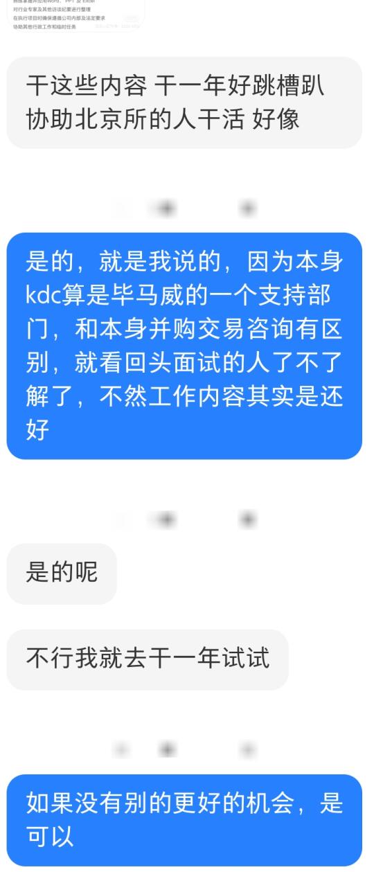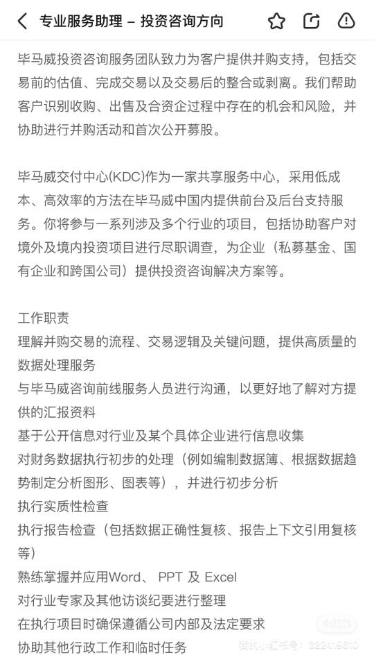 前阵子有粉丝问毕马威kdc的投资咨询部怎么样,岗位内容乍一看的确跟我们常说的四大热门业务线并购交易咨询高度相关,甚至可以说几乎就是并购交易部相对junior一些的伙伴们常做的工作,但外界或许很多并不太知道kdc是什么样的工作定位,所以看到这些JD描述很容易误解为就是并购交易部。