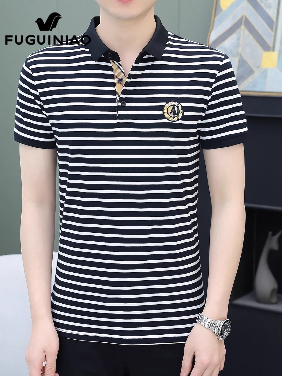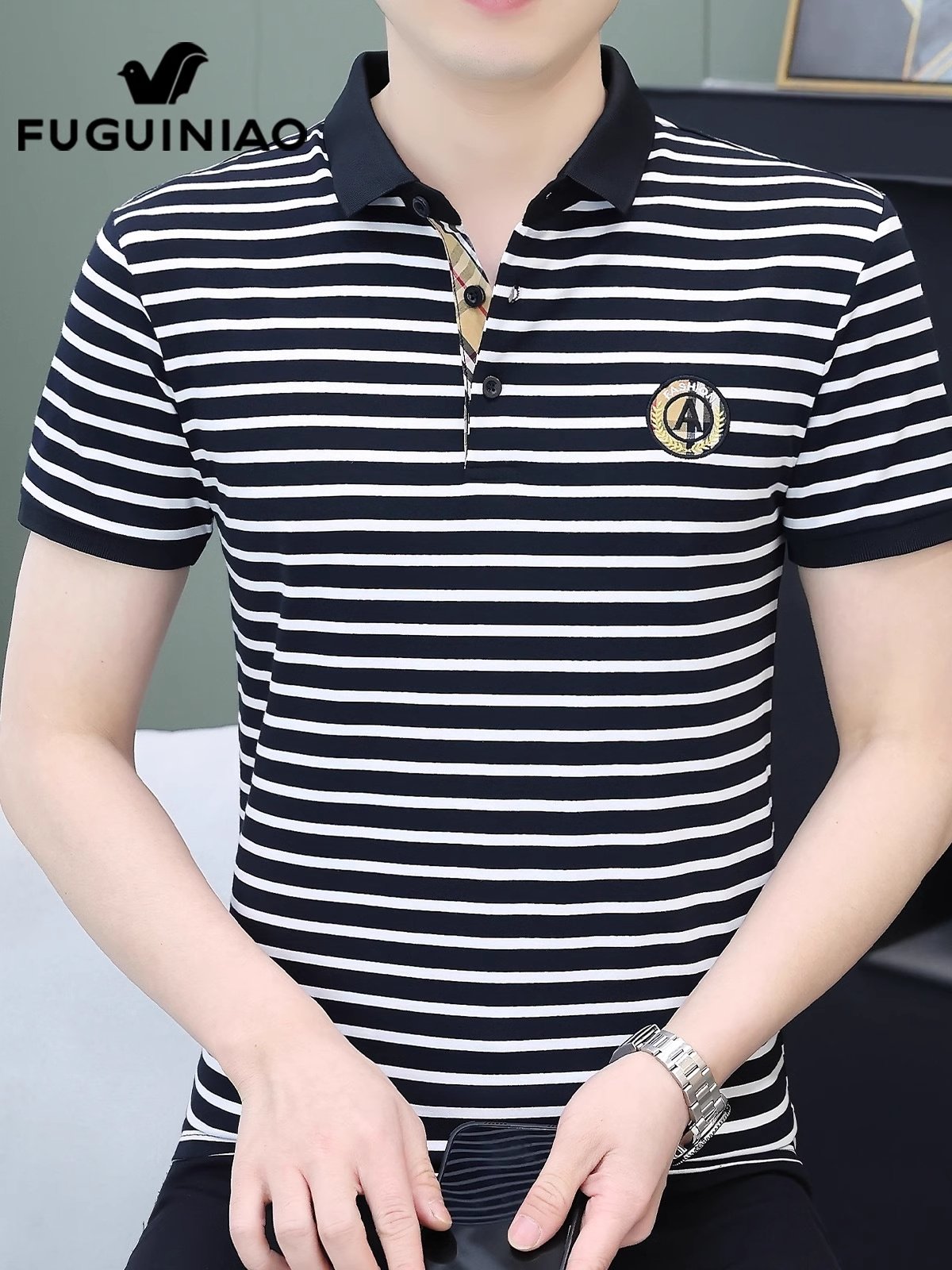 富贵鸟男士短袖t恤夏季新款条纹上衣服休闲翻领polo衫男装
