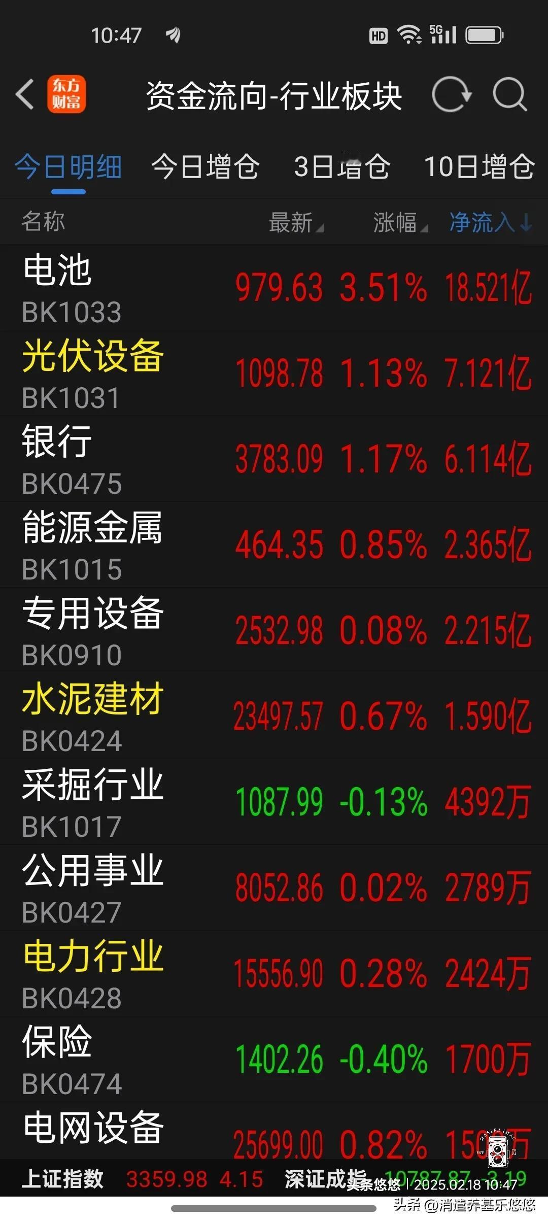 18日午间看盘及加仓榜 今天上午大盘低开高走,沿着5日线上升,截止10否50分,两市成交额8700亿元,比昨天萎缩1900亿元,主力资金流出370亿元。 盘面上,电池,光伏设备,银行,能源金属等板块涨幅居前。 教育,商业百货,文化传媒,医疗服务,互联网服务等板块跌幅靠前。 资金流入靠前的板块有电池,光伏设备,银行,能源金属,建材等。 资金流出靠前的板块有互联网服务,软件开发,文化传媒,半导体,通信设备等。