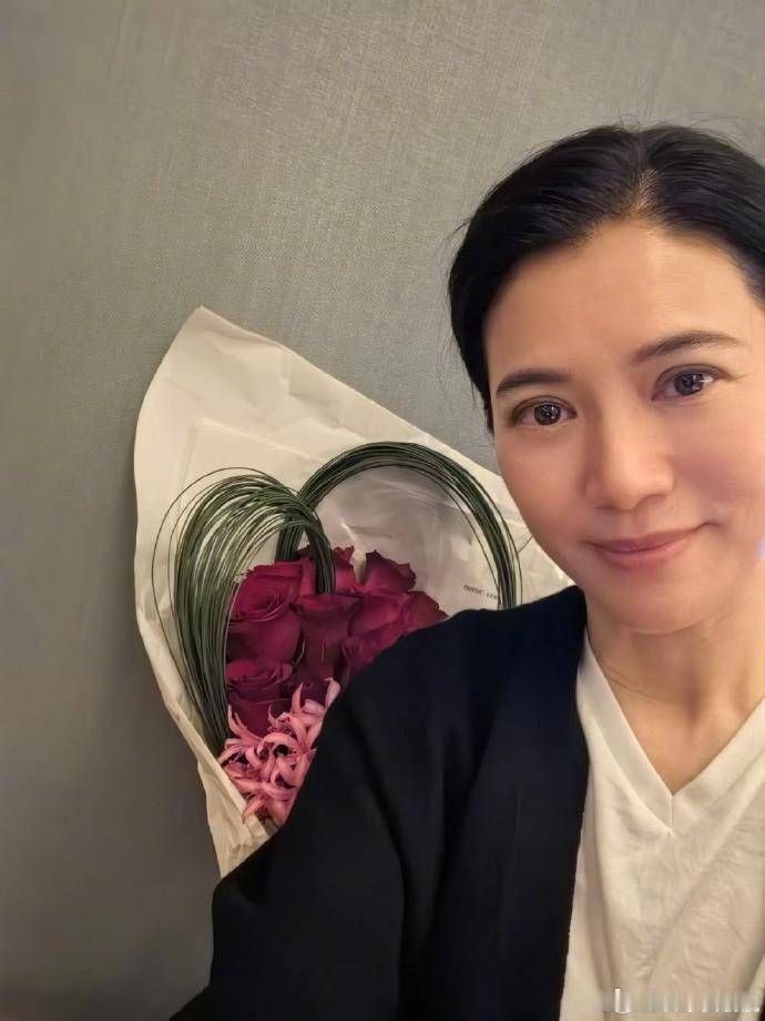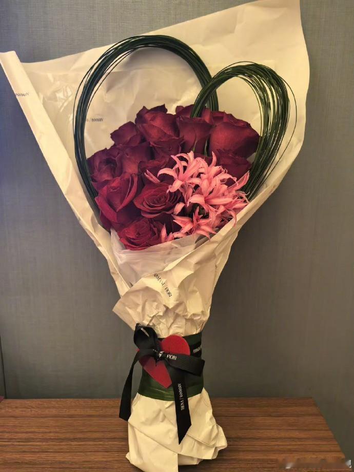 黄圣依情人节晒照,抱着一大束花和秀出爱心大钻戒,看着心情就很不错[哈哈] 而前夫
