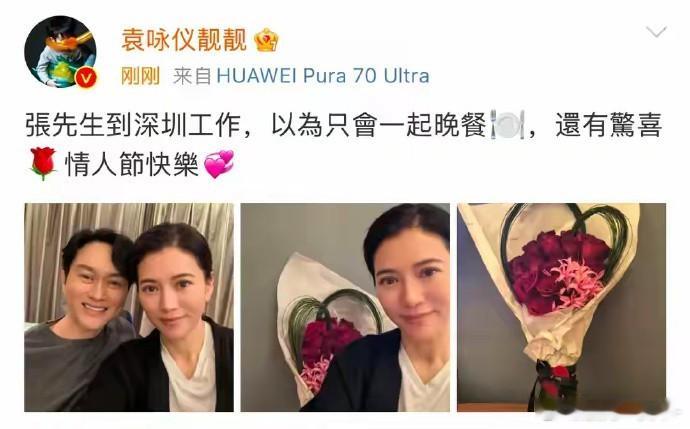 袁咏仪情人节晒与张智霖的合照两人都是53岁,但都看不出真实年龄,保养得超好,还