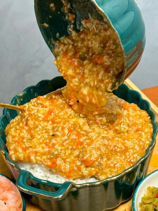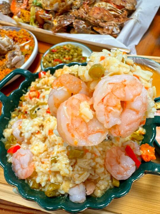 还有蟹黄虾仁捞饭,满满一碗蟹膏蟹黄、虾仁、小咸菜……一起倒进饭里伴着吃,粒粒分明,还都带着蟹黄!!!