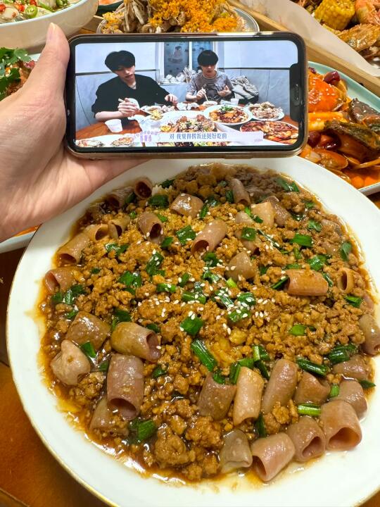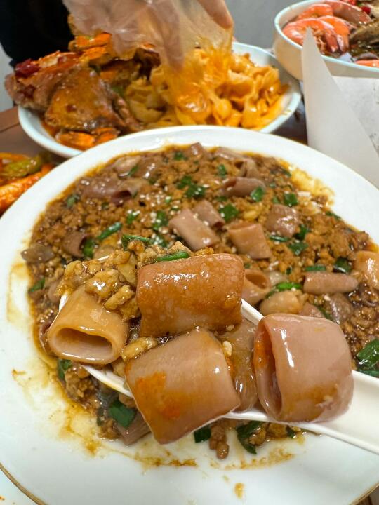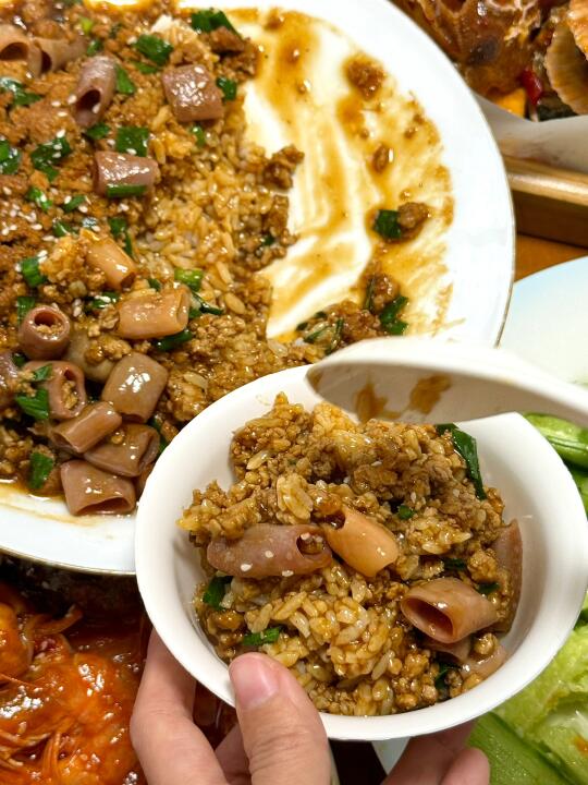 狂炫海肠捞饭!!确实和别家不一样,上面都是大海肠,海肠和肉沫的量给的好多,拌匀黏黏糊糊的香拽了