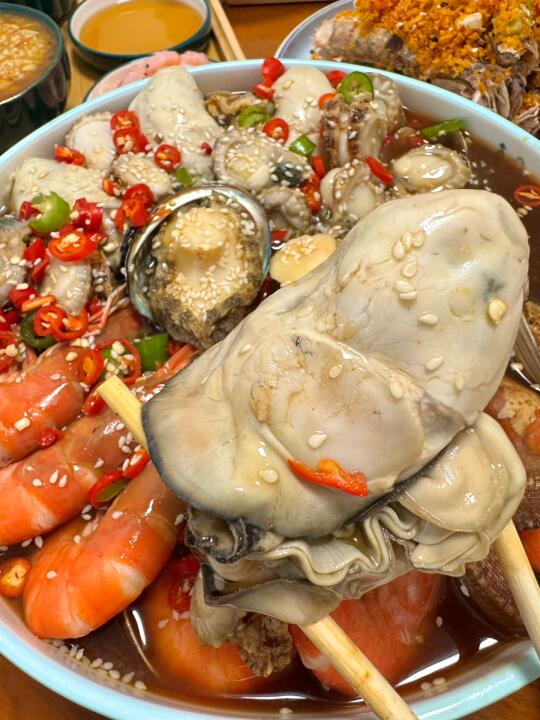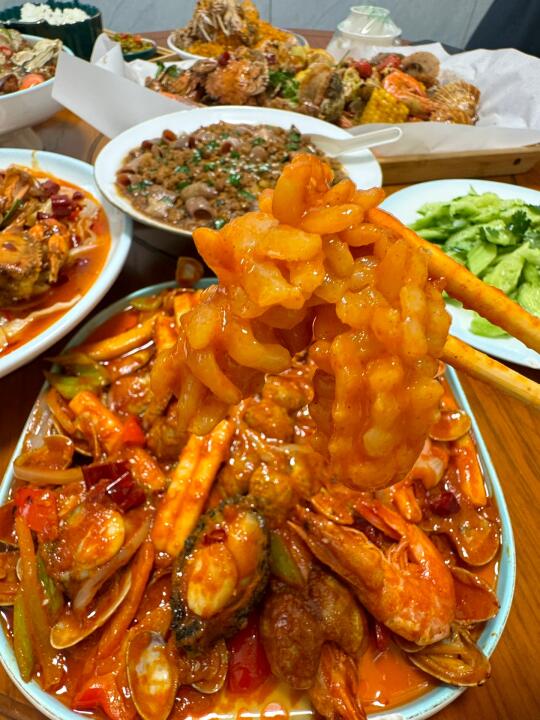海鲜烩年糕甜辣口的,年糕搭着各种海鲜一大份。