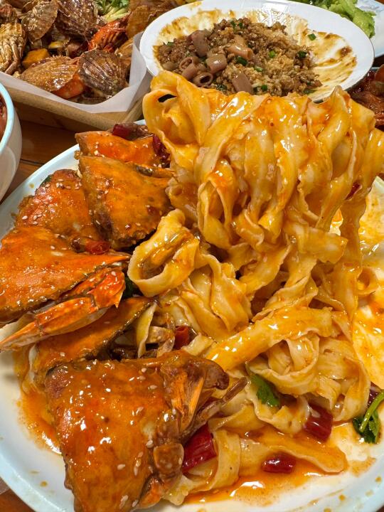 还吃了哥俩炫的香辣螃蟹拌面,螃蟹个顶个肥,都有黄!!手擀宽面是灵魂,裹满汤汁嗦着贼香