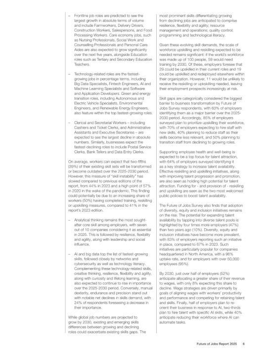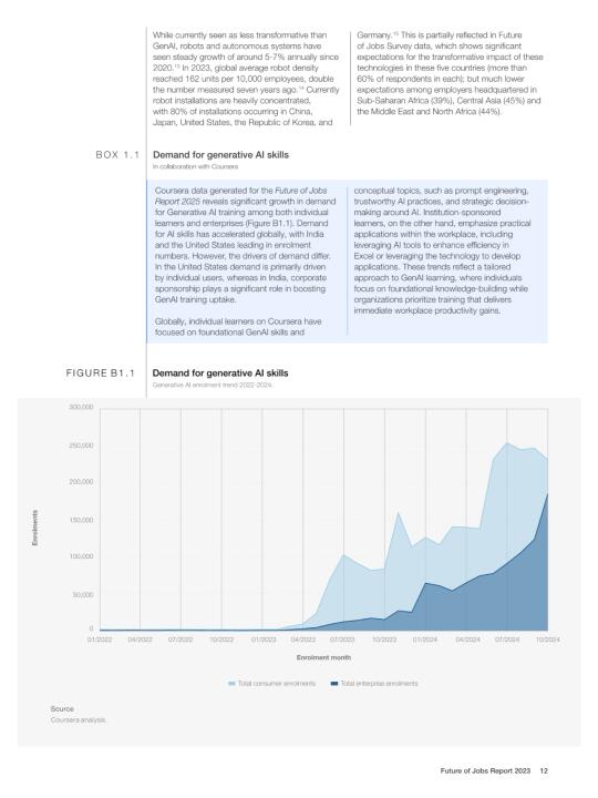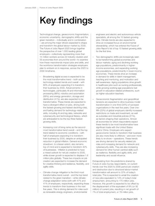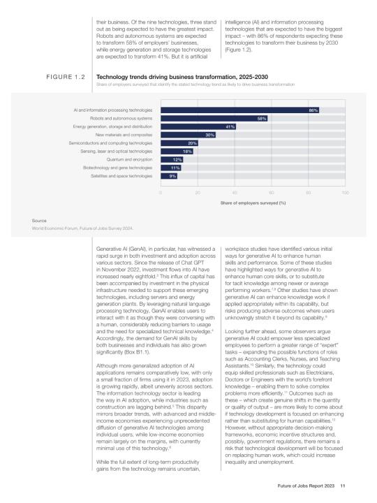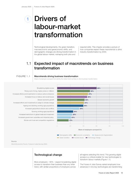 📈 技术变革是最大的驱动力,尤其是生成式人工智能(GenAI)和大数据分析,将推动许多行业的转型。绿色转型和应对气候变化的努力也将创造大量新的就业机会,比如可再生能源工程师和电动汽车专家。不过,一些传统的行政和文职工作可能会受到自动化的影响而减少。