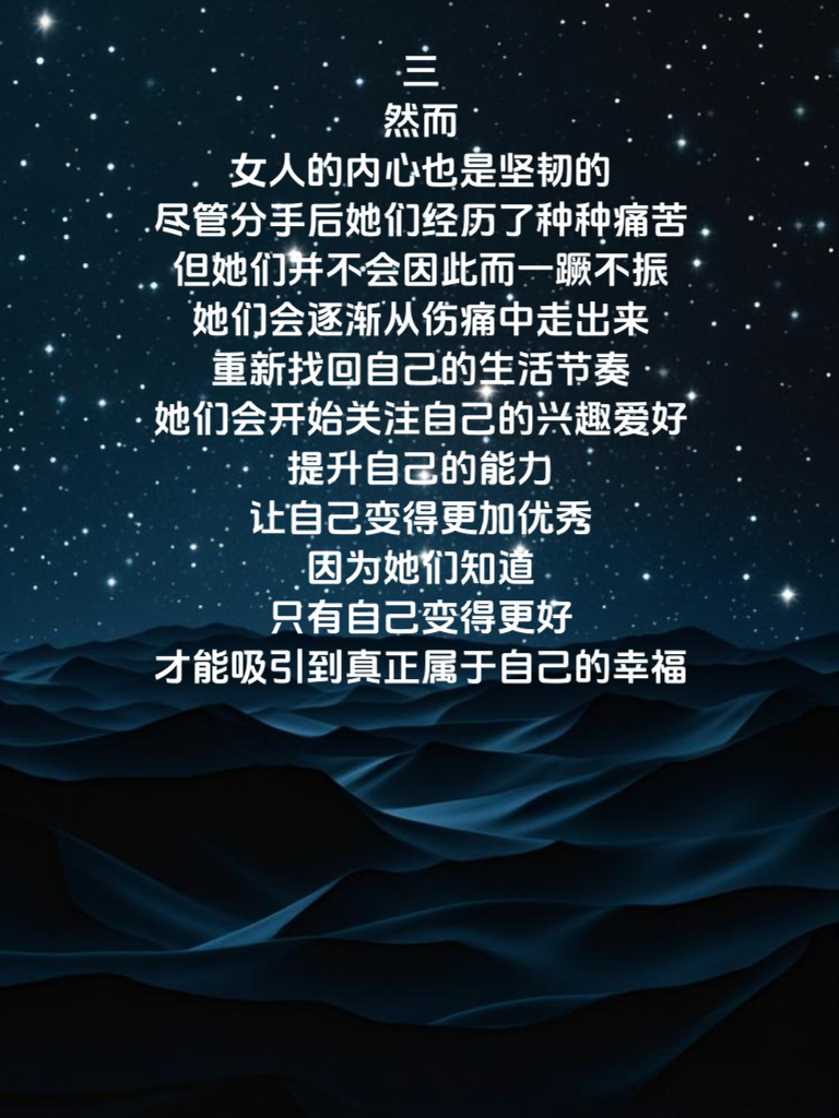 一、女人分手后,往往会陷入深深的自我反思之中。她们会回忆起曾经的点点滴滴,那些甜蜜的瞬间和争吵的画面在脑海中交织,仿佛一场电影般不断回放。她们开始思考这段感情的得失,试图找出自己在其中的不足之处,这种自我剖析往往让她们陷入痛苦和迷茫之中。 二、分手后的女人,内心的情绪如同波涛汹涌的大海,时而平静,时而汹涌。她们可能会在某个瞬间突然情绪崩溃,泪流满面;也可能在表面上看似平静,内心却在默默疗伤。她们会对未来感到恐惧和不安,不知道自己该如何继续前行,这种不确定性让她们的心灵备受煎熬。 三、然而,女人的内心也是坚韧的。尽管分手后她们经历了种种痛苦,但她们并不会因此而一蹶不振。她们会逐渐从伤痛中走出来,重新找回自己的生活节奏。她们会开始关注自己的兴趣爱好,提升自己的能力,让自己变得更加优秀。因为她们知道,只有自己变得更好,才能吸引到真正属于自己的幸福。