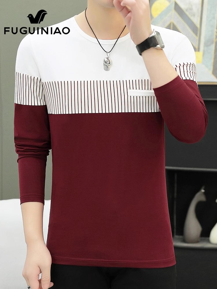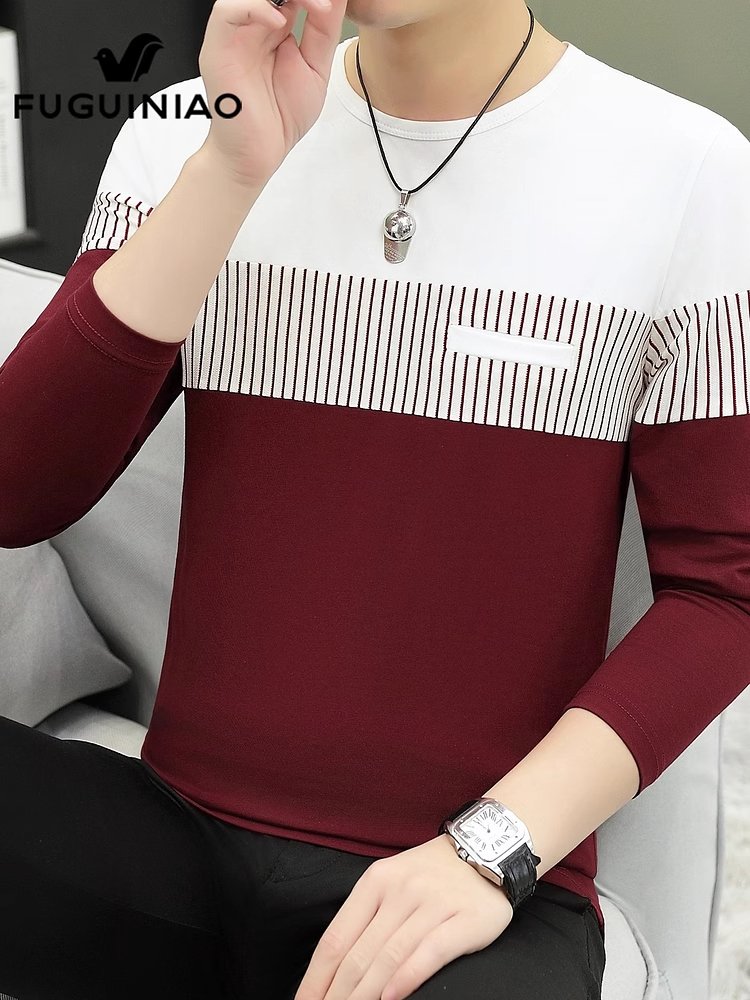 富贵鸟拼色长袖t恤男士春季新款宽松打底衫休闲圆领卫衣男