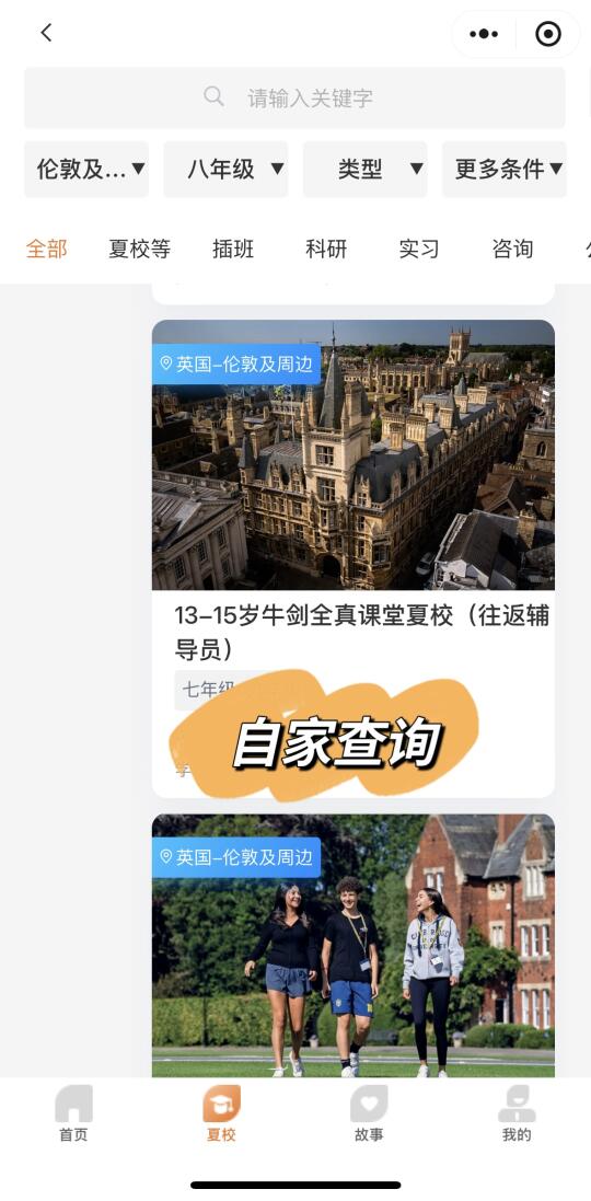 [向右R]我家孩子现在初二,想趁着暑假去英国提升英语水平,感受纯正的英伦文化。用这个小程序搜索简直太方便了!打开小程序,在搜索栏选好“初二”年级,再挑“英国”目的地,瞬间就跳出好多优质项目。点进心仪的项目内页,学校环境、课程安排、学生评价一目了然。看了几个项目后,心里瞬间有了底,再也不用像没头苍蝇一样四处乱找信息!