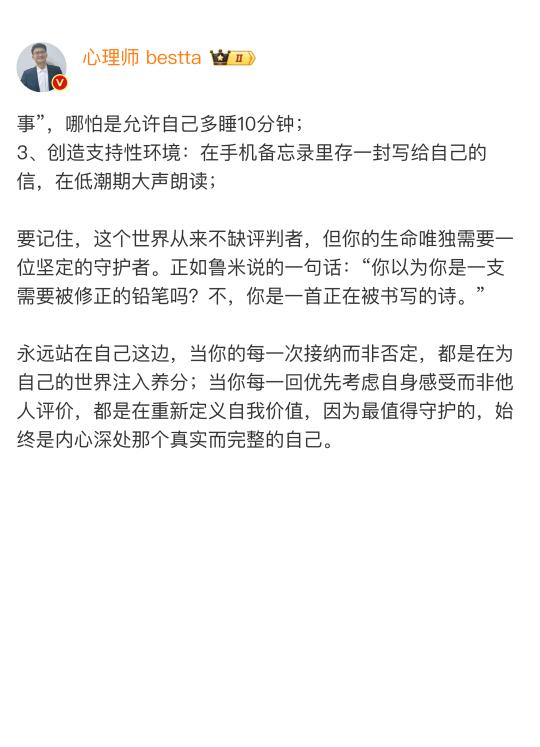 要记住,这个世界从来不缺评判者,但你的生命唯独需要一位坚定的守护者。正如鲁米说的一句话:“你以为你是一支需要被修正的铅笔吗?不,你是一首正在被书写的诗。”