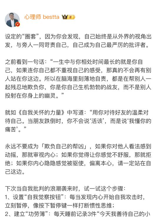 就如《自我关怀的力量》中写道:“用你对待好友的温柔对待自己。当朋友跌倒时,你不会说‘活该’,而是说‘我懂你的痛苦’。”