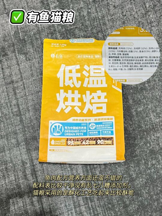 有鱼猫粮:鱼肉配方,营养方面还蛮不错的。配料表比较干净,没有添加了乱七八糟的添加剂。猫粮采用的是酥化工艺,吃起来比较酥脆,没有油腻感口感比较好。