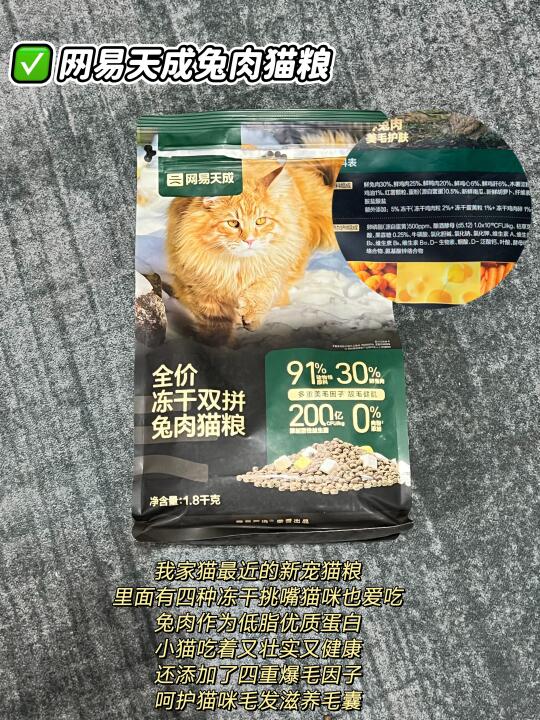 网易天成兔肉猫粮[搜索高亮]:我家猫最近的新宠猫粮,里面有四种冻干,挑嘴猫咪也爱吃。兔肉配方,作为低脂优质蛋白,小猫吃着又壮实又健康。还有四重爆毛因子,我家猫咪吃了一段时间,掉毛真的少了很多,而且摸起来贼顺滑,现在更好rua了。