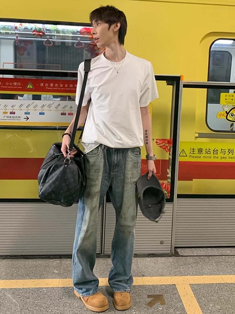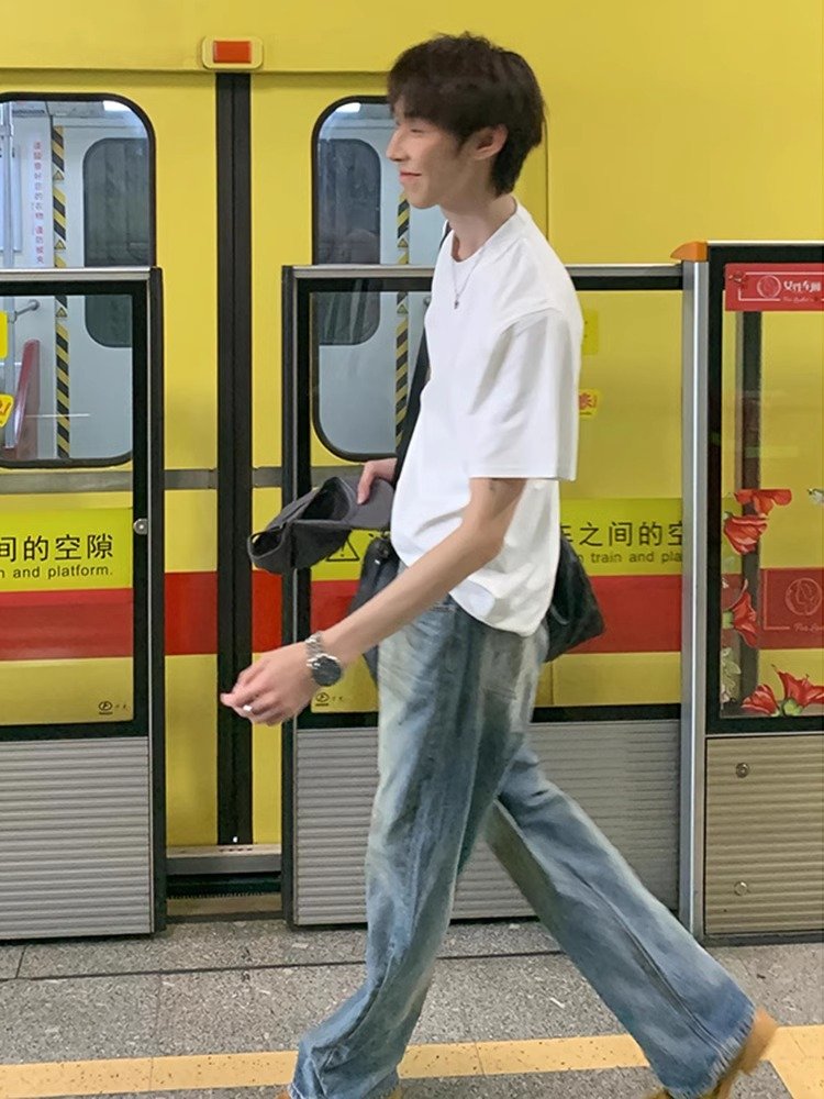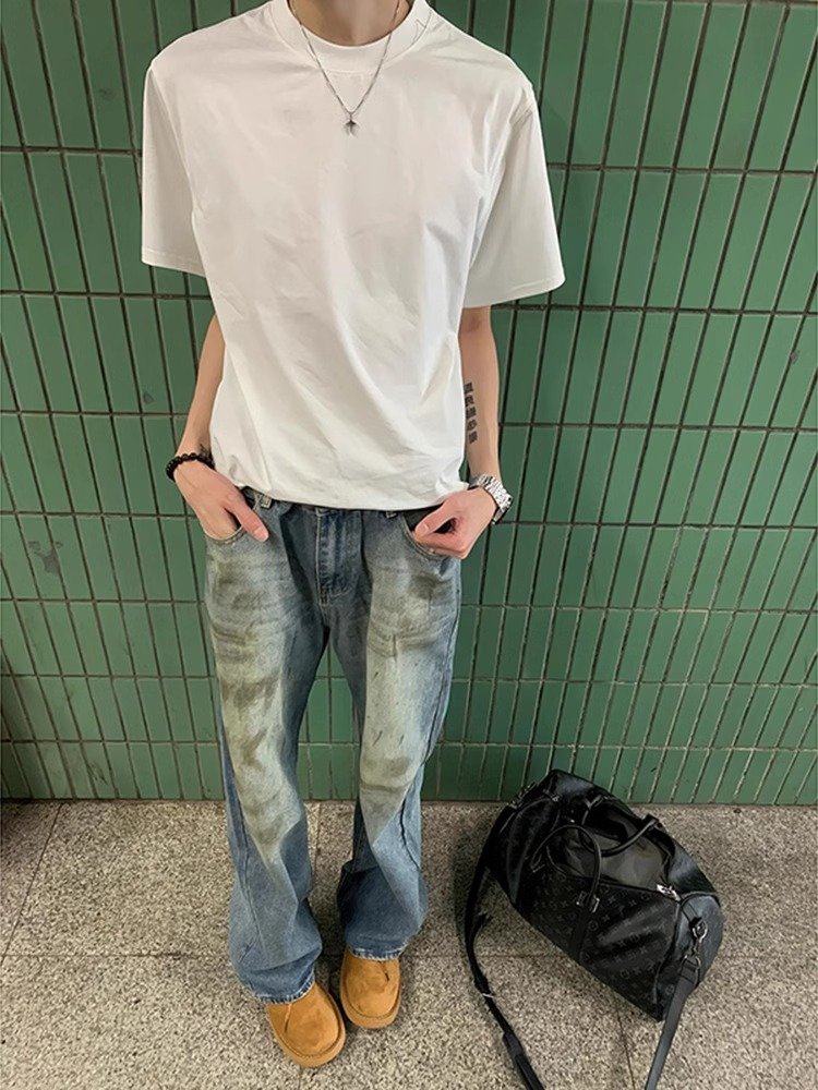 毛边牛仔拼接垫肩短袖男款夏季重磅小领口t