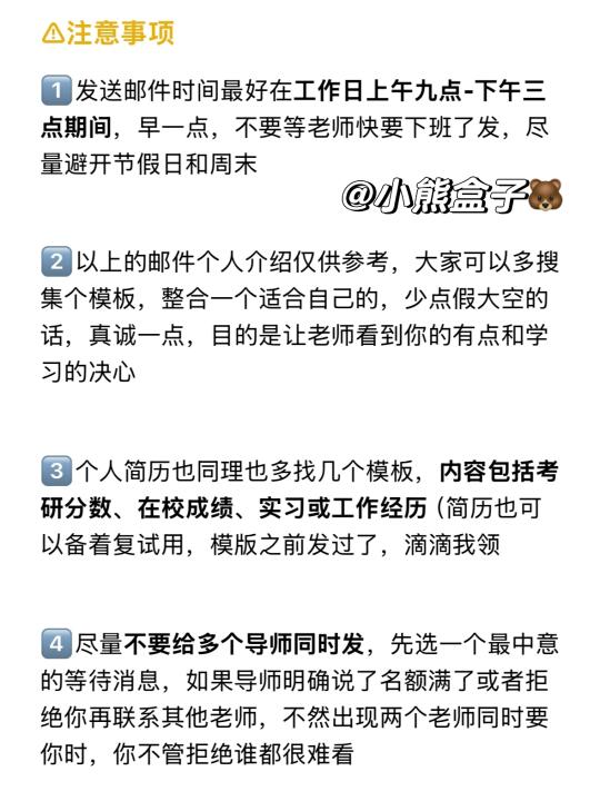 1⃣发送邮件时间最好在工作日上午九点-下午三点期间,早一点,不要等老师快要下班了发,尽量避开节假日和周末