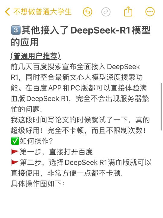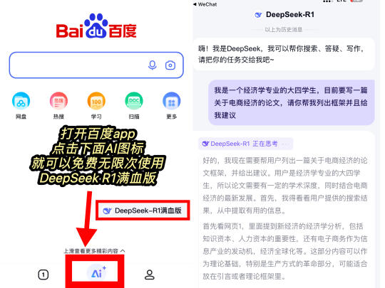 前几天百度搜索宣布全面接入DeepSeek R1,同时整合最新文心大模型深度搜索功能。在百度APP和PC版都可以直接体验满血版DeepSeek R1,完全不会出现服务器繁忙的问题.我这段时间写论文的时候就试了一下真的超级好用!完全不卡顿,而且不限制次数!