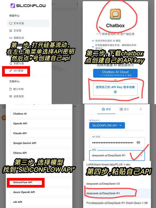 第五步:进入app后,选择模型找到“SILICONFLOW API”—把密钥粘贴—选择DeepSeek-R1保存设置 就可以畅通无阻了。