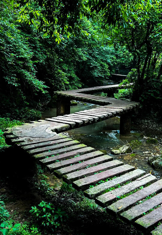 龙隐栈道:木质栈道与溪流交错,适合广角镜头 。