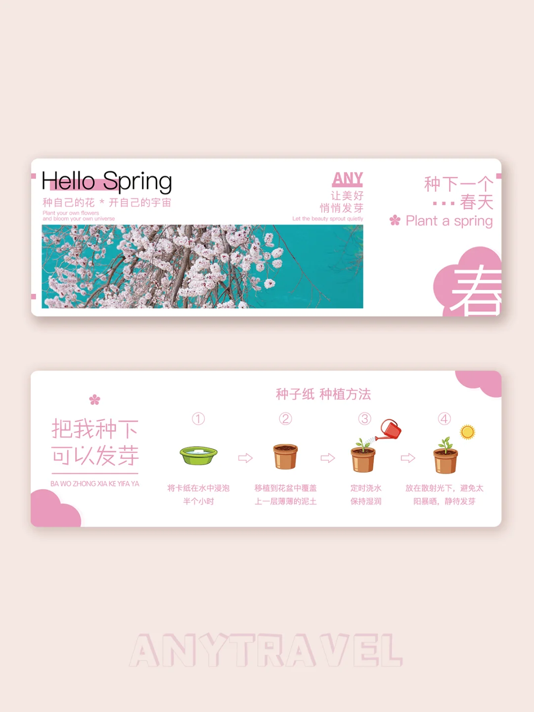 今年春天玩的就是「花」🌸 参与杏花产品团的客人,都能获取AnyTravel限定花花周边——春日种子纸🌱 · 携一份春天最轻的伴手礼回家,这一次,带走的不是风景,而是一片会生长的「远方」⛰️薄薄一张,却满载回忆 · 小小的种子安静沉睡其中,等待你去唤醒。回家后浸水覆泥种植,纸张化作春泥,小苗破土绽放,让旅途在窗前延续 · 🍃种子纸背后附赠种植指南,小白也能轻松养出满窗春色! 🍃注意避免高温播种,种子会进入休眠种植,保持土壤湿润、阴凉通风有光照