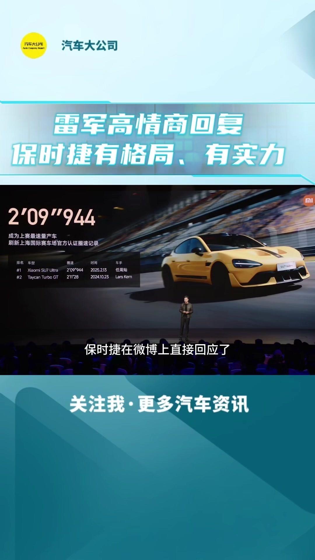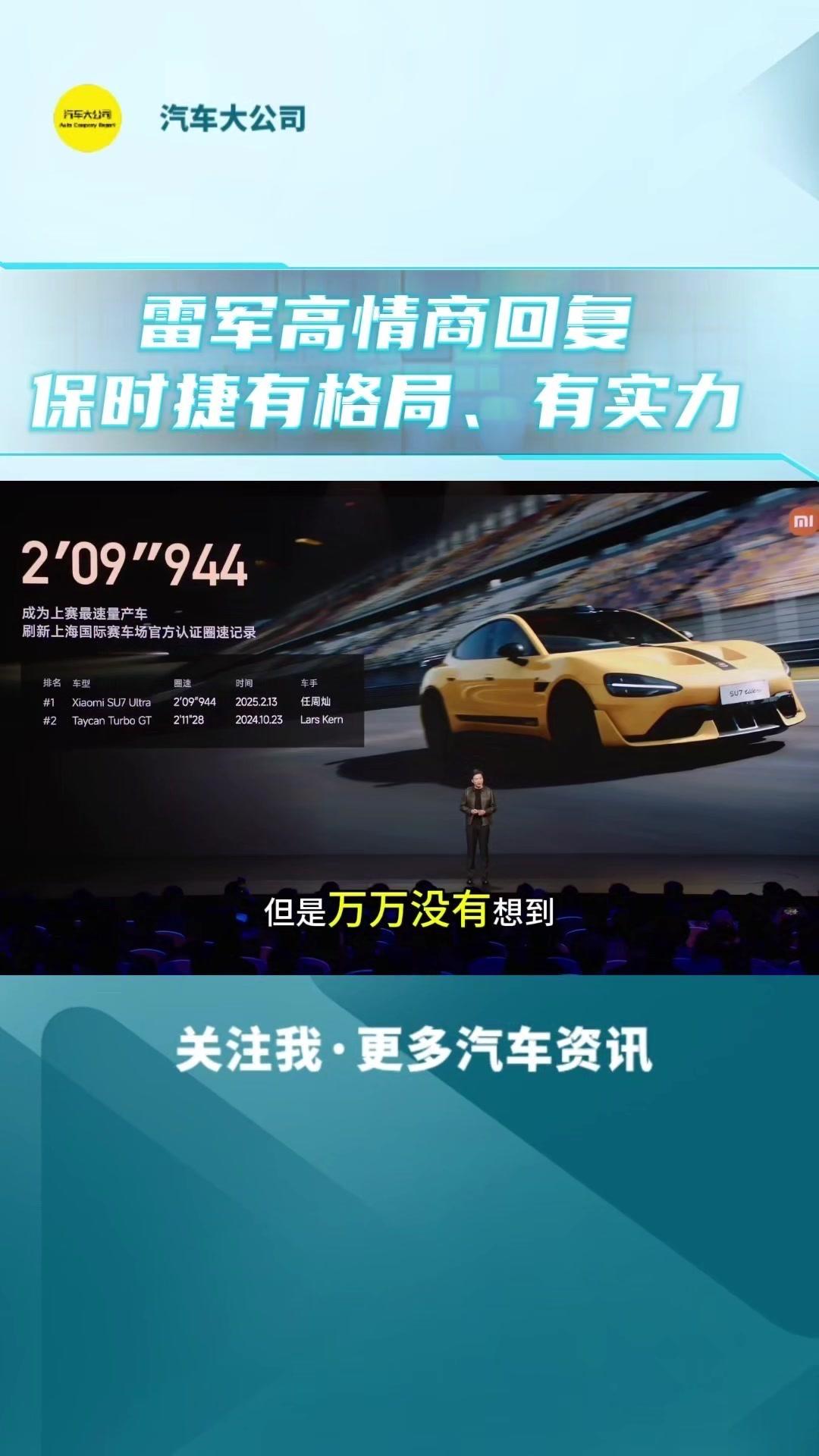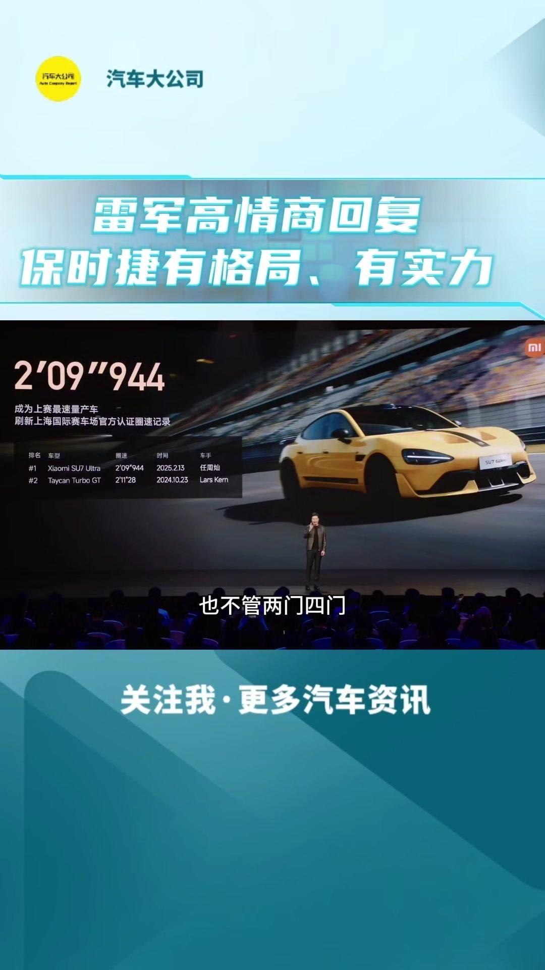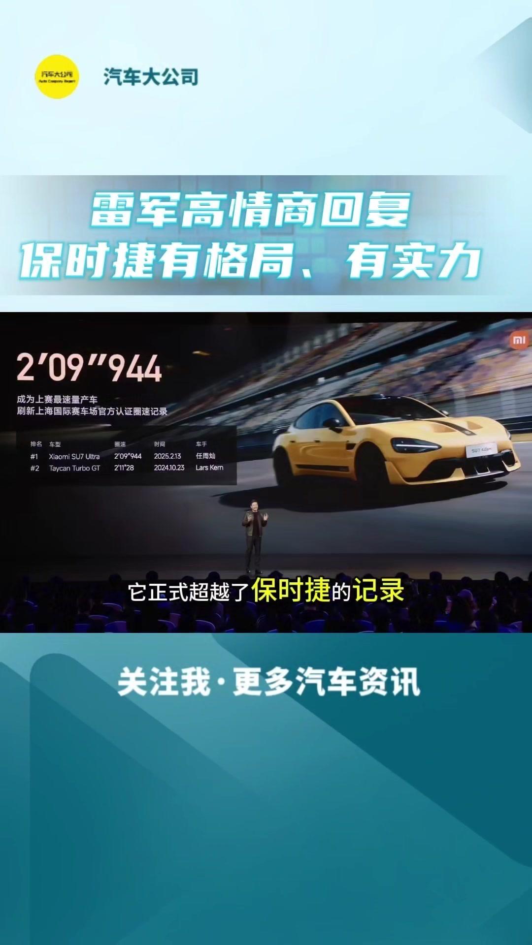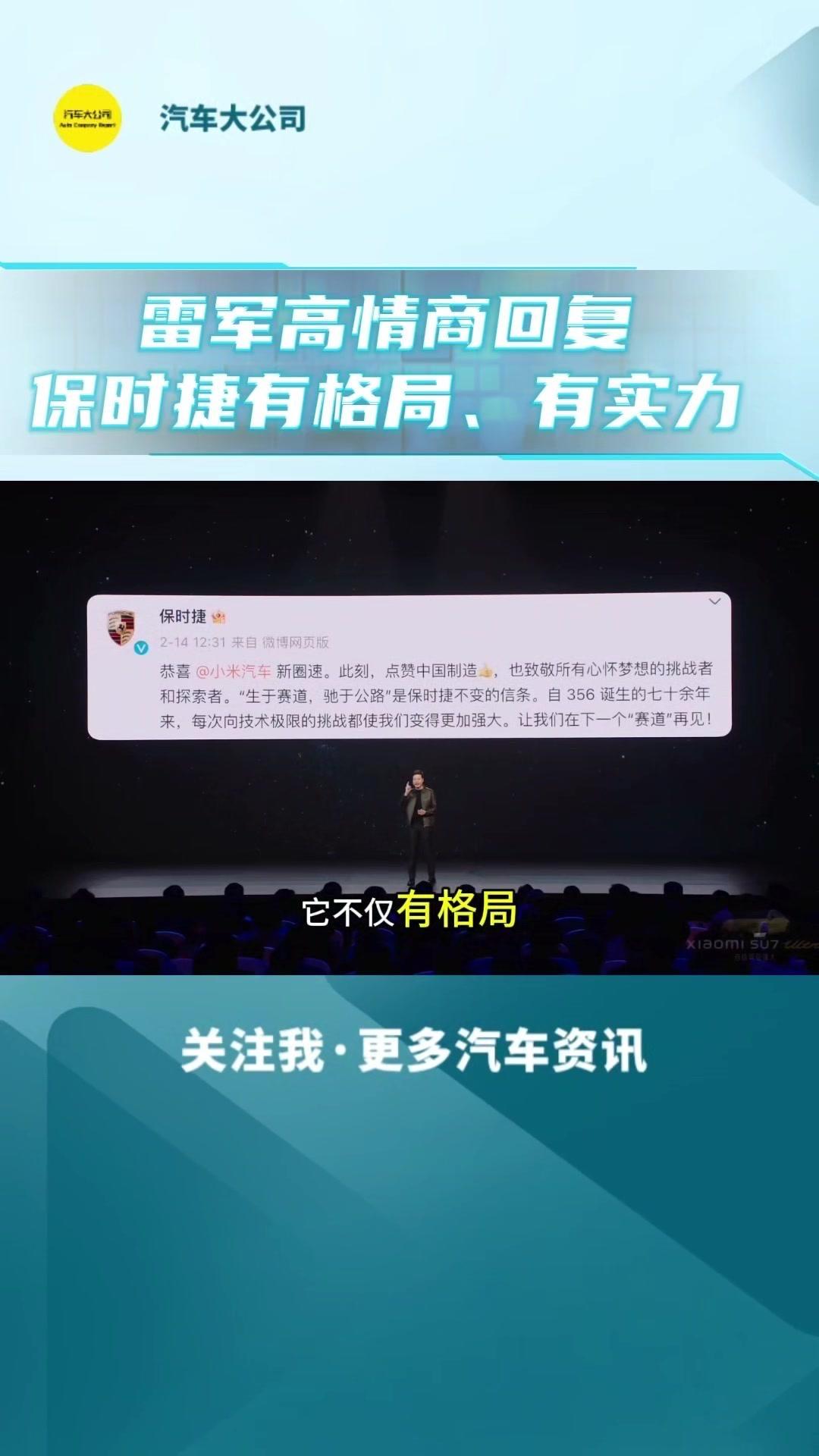 🚀小米发布会亮点: 1️⃣小米su7ultra量产车极速,成为无可争议的量产第一,不管能源一致,也不管两门四门。 2️⃣保时捷在微博上直接回应祝贺小米的新天术,点赞中国制造。国际大厂有格有格局,更加佩服保时捷,有90多年历史,面对过无数像小米这样的奋头军的挑战者,非硬能硬的挑战下来,经历90多年,始终风雨不倒,所以保时捷真的很厉害,有格局,更有实力。 3️⃣小米作为汽车行业的新人,能跟保时捷这样的国际大厂竞技,是小米的幸运,哪怕输了也不丢人。