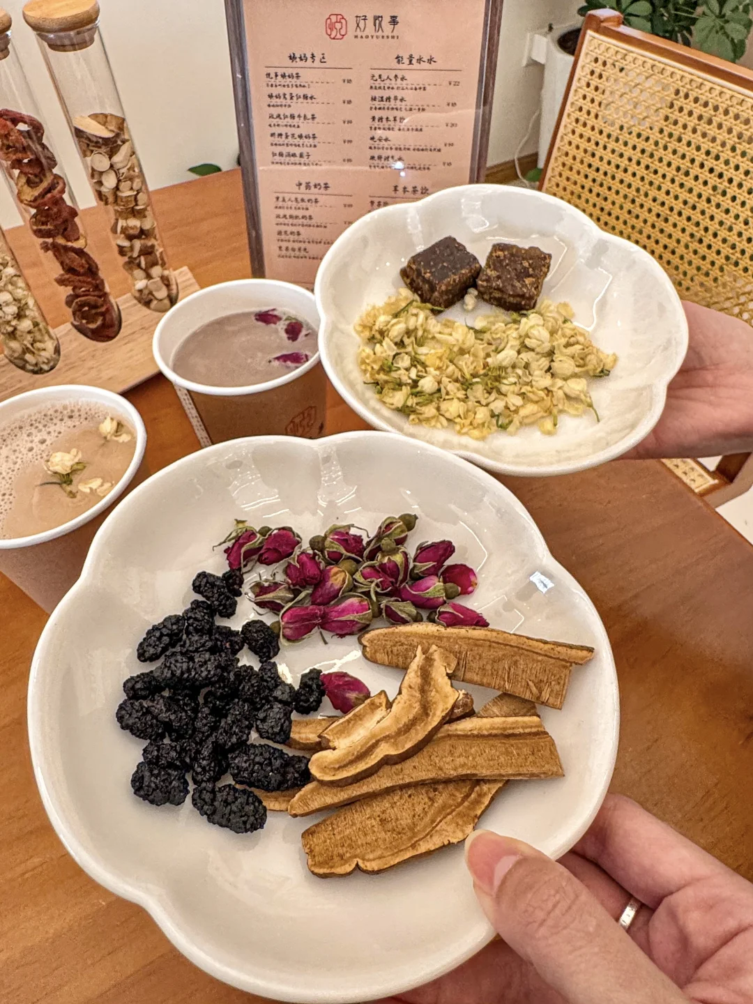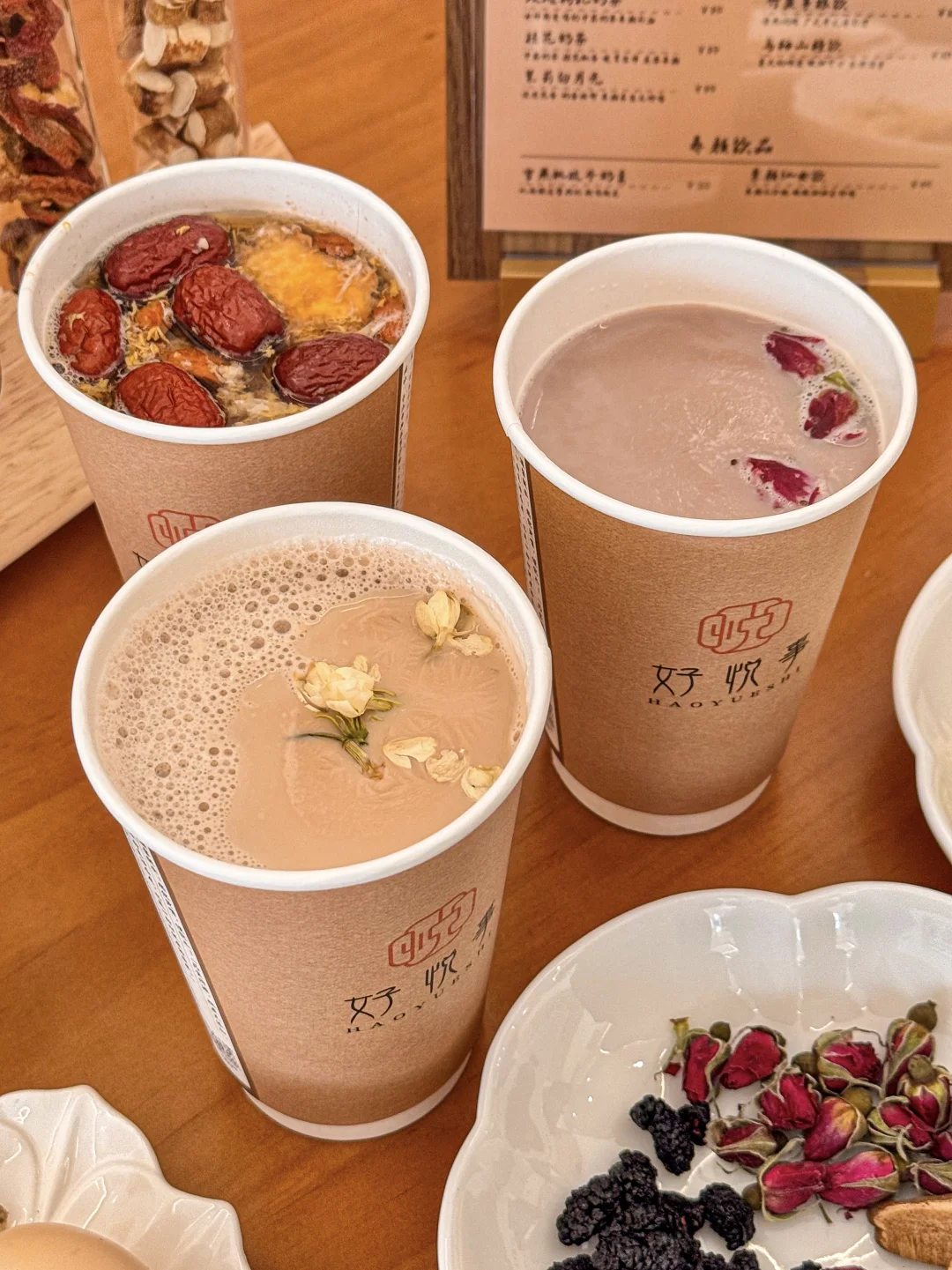这家的奶茶就老养生了!! 尤其对咱女生特殊时期暖身补气血很有帮助! ♨️姨妈热饮、中💊奶茶、草本饮料……各种不同功效 主要配料也很干净 都是现场熬煮的!