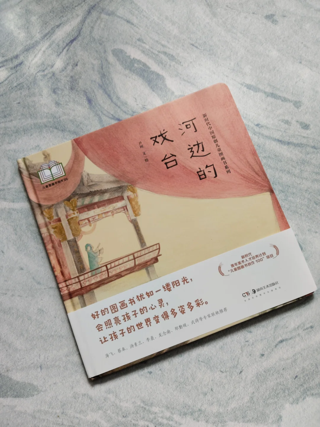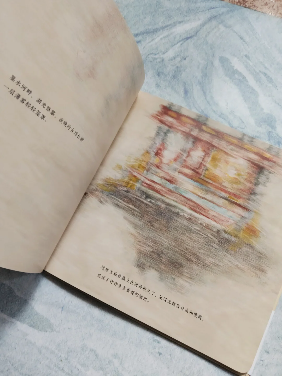 而我们正在阅读的这本《河边的戏台》就是这一系列儿童图画书中的一本,作者尹珂是一位美术方向的研究生,而且已经有了自己成熟的作品。那么他的这样一本绘本给孩子们讲述了一个怎样的故事呢?