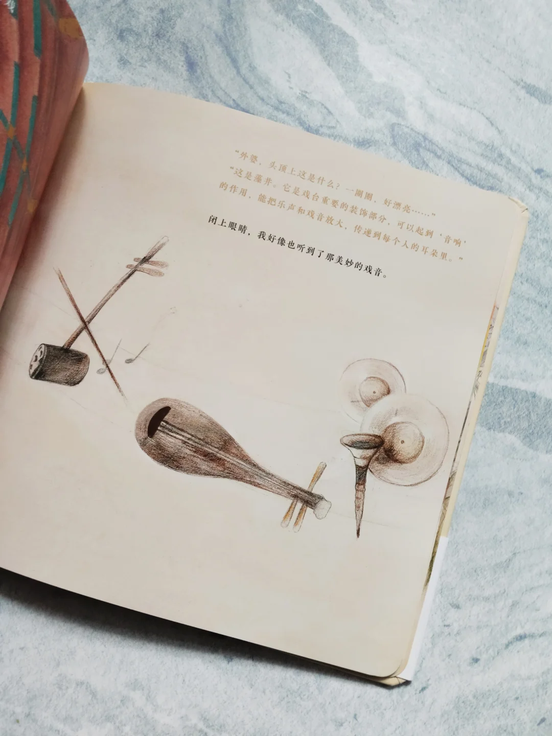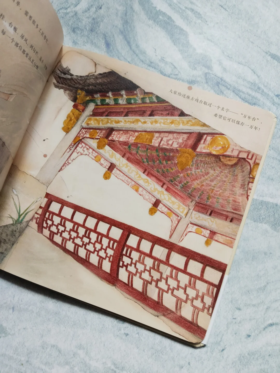 当然这些了解也同样能够刺激孩子们寻求刺激的欲望,如果孩子们对于其中的某一个细节产生兴趣,就能让他们受益一生。即使无法让孩子立马喜欢上这些,绘本所提供的内容也同样会开启孩子们好奇的视角,帮助他们去探索周边的世界。说不定差不多的古戏台就在孩子们身边,就能让孩子们也对身边的这些老物件产生兴趣,这不同样是一种对于孩子的启蒙吗?