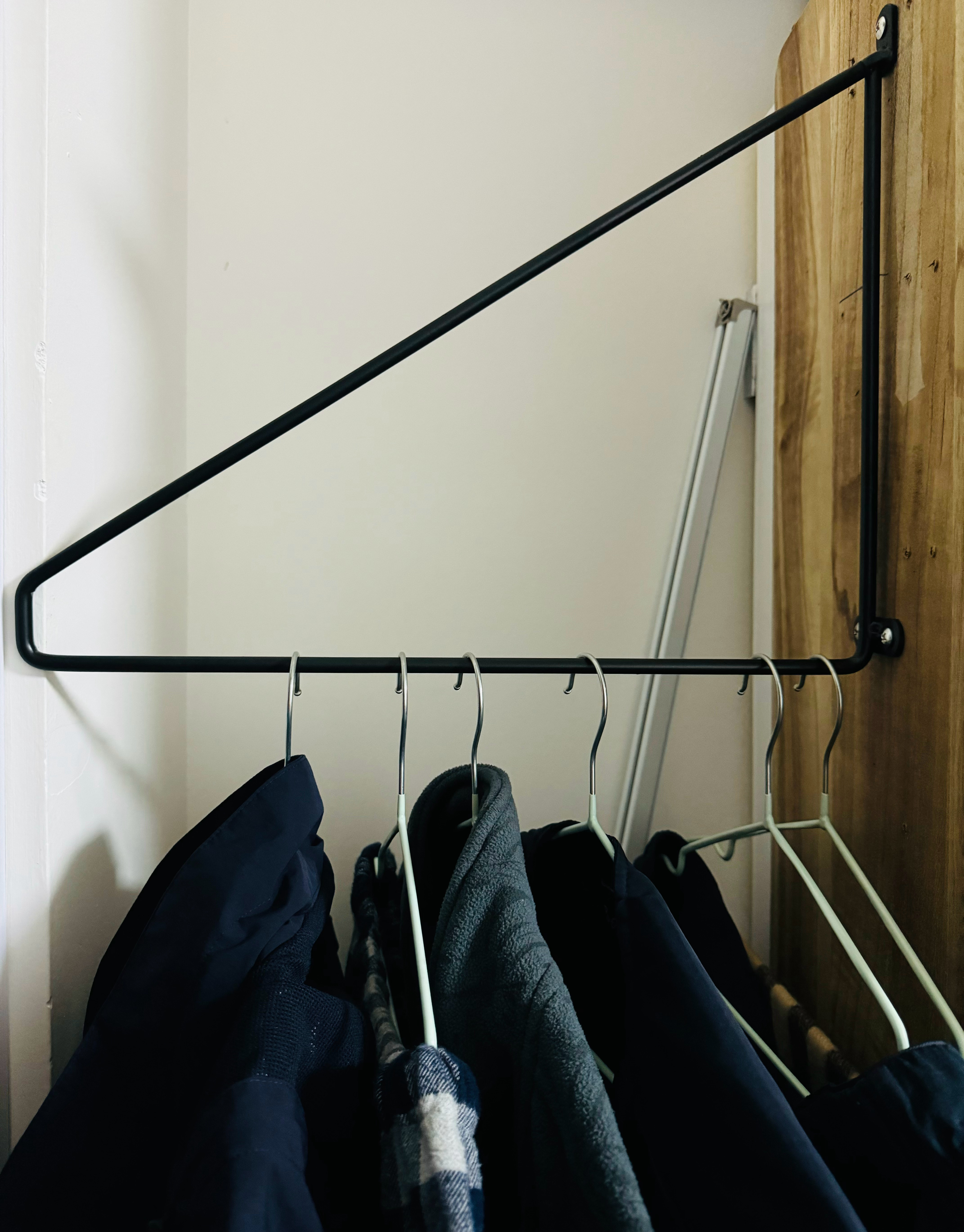 办法总比困难多[吃瓜]买一根三角形层板托架,这条40公分的缝就被我弄成临时挂衣区,质量杠杠的,你把我吊上去都不带变形的。