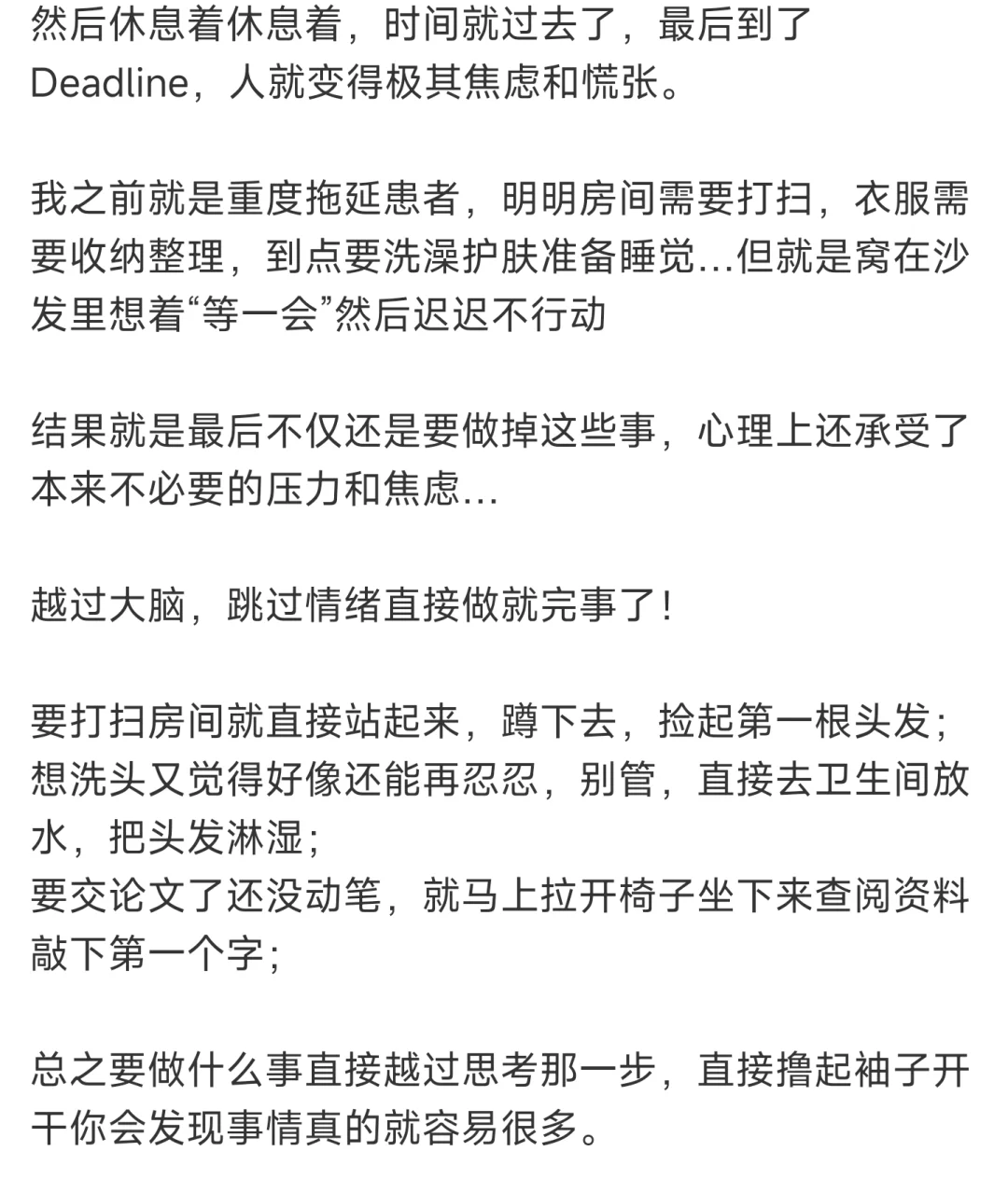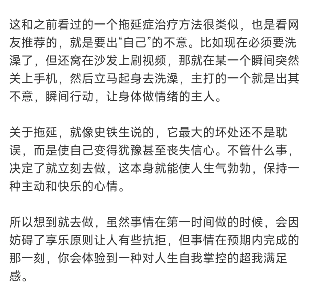 想到什么事情,马上去做。 这一方法真的帮我战胜了拖延。 比如,过去我脑海中有一个想法,我怕麻烦,不想马上去记录,过了几分钟,想法就消失了。 有个老师跟我说,你这样不行,有了想法,就要马上记下来。这样,你才不会忘。我听话照做,现在有了想法,我会记在软件了,或者发个朋友⭕,慢慢也积累了特别多的想法和灵感。