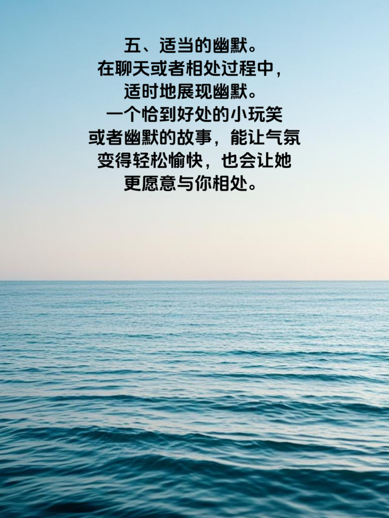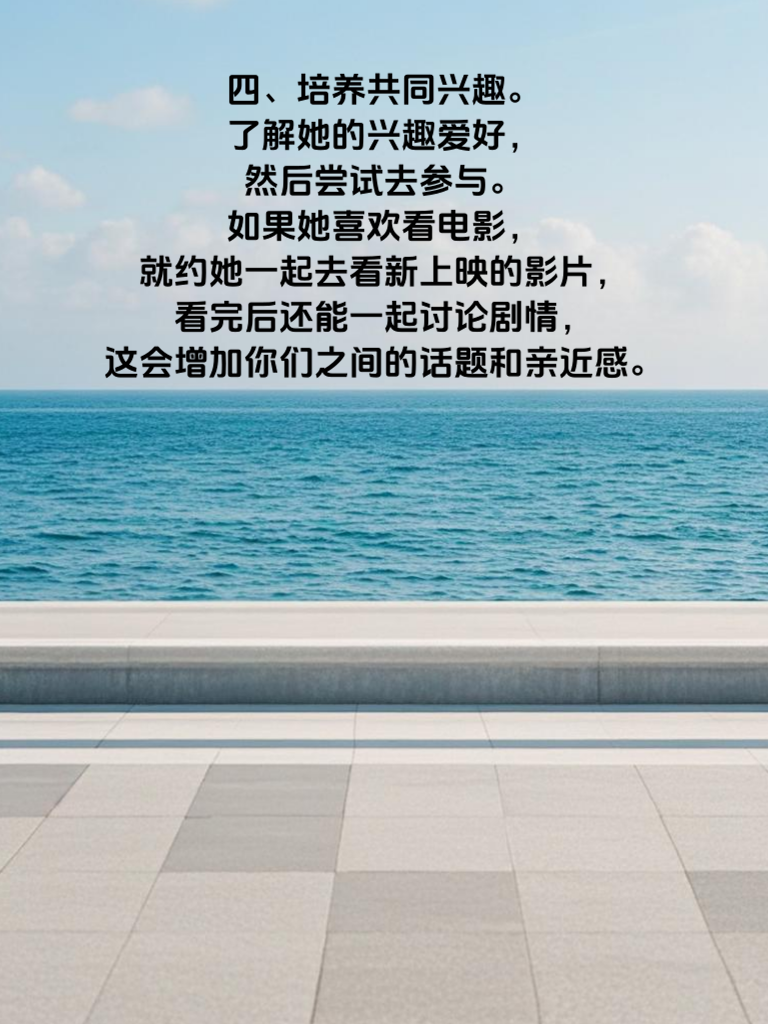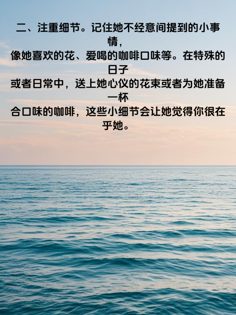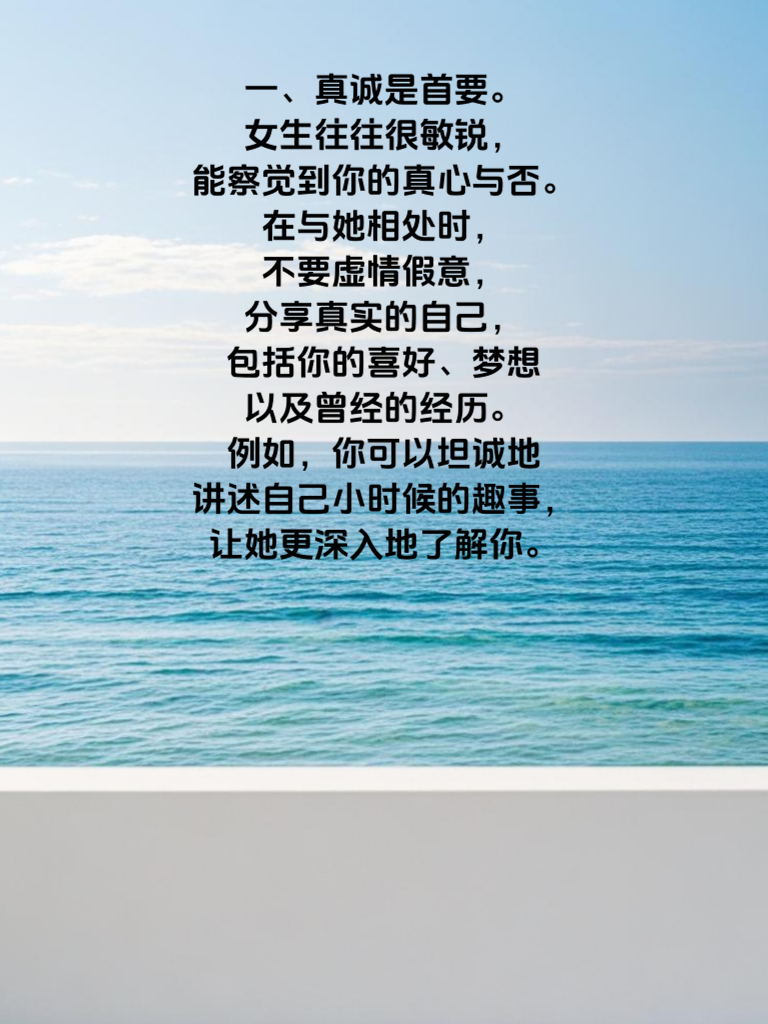 一、真诚是首要。女生往往很敏锐,能察觉到你的真心与否。在与她相处时,不要虚情假意,分享真实的自己,包括你的喜好、梦想以及曾经的经历。例如,你可以坦诚地讲述自己小时候的趣事,让她更深入地了解你。 二、注重细节。记住她不经意间提到的小事情,像她喜欢的花、爱喝的咖啡口味等。在特殊的日子或者日常中,送上她心仪的花束或者为她准备一杯合口味的咖啡,这些小细节会让她觉得你很在乎她。 三、展现自信。自信的男生自带魅力光环。走路抬头挺胸,说话时声音洪亮且有条理。但要注意,自信不是自负,不要过度吹嘘自己。 四、培养共同兴趣。了解她的兴趣爱好,然后尝试去参与。如果她喜欢看电影,就约她一起去看新上映的影片,看完后还能一起讨论剧情,这会增加你们之间的话题和亲近感。 五、适当的幽默。在聊天或者相处过程中,适时地展现幽默。一个恰到好处的小玩笑或者幽默的故事,能让气氛变得轻松愉快,也会让她更愿意与你相处。