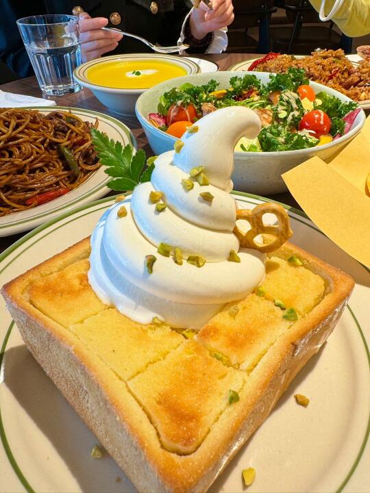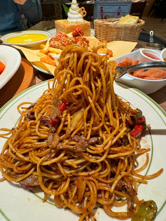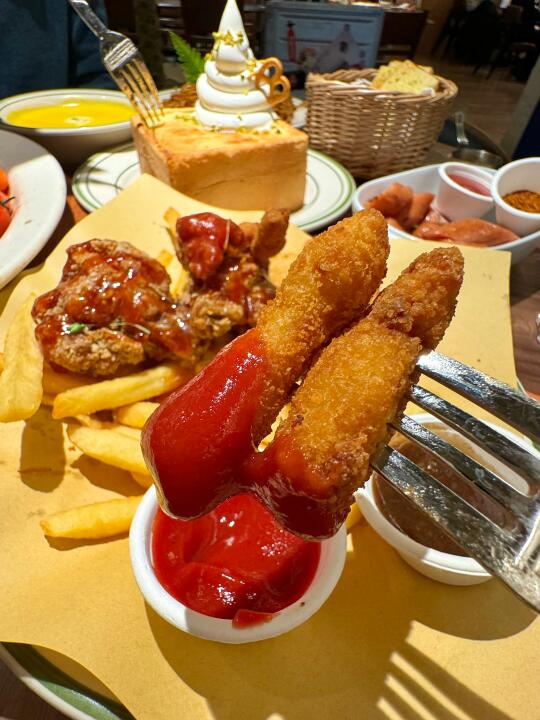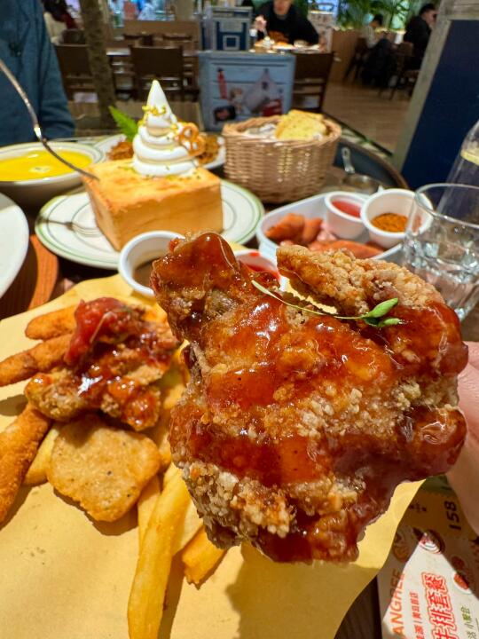除了有点不好找,没啥毛病 蜂蜜厚多士、牛排、黑椒意面、炸鸡、奶油南瓜汤…158r三人饱饱的,还遇到了外果人,很chill