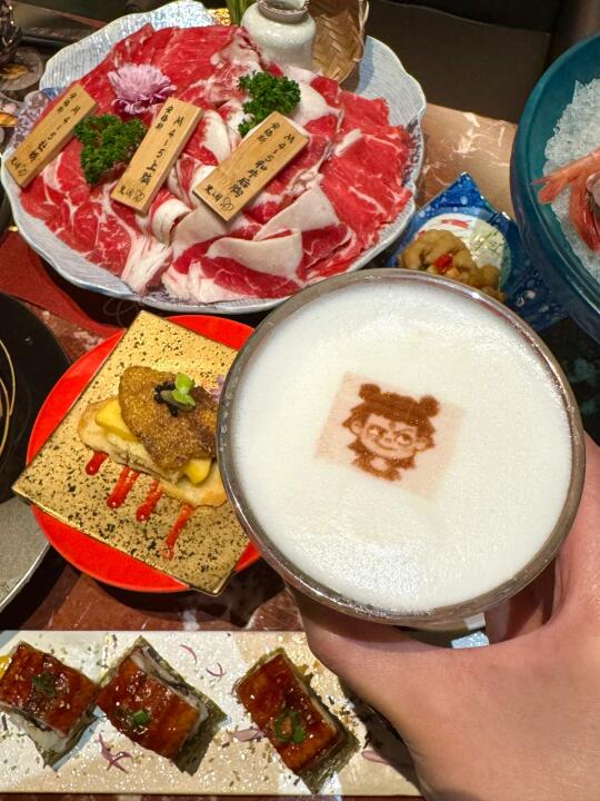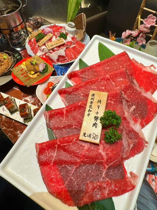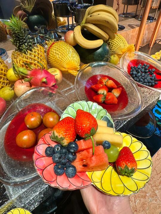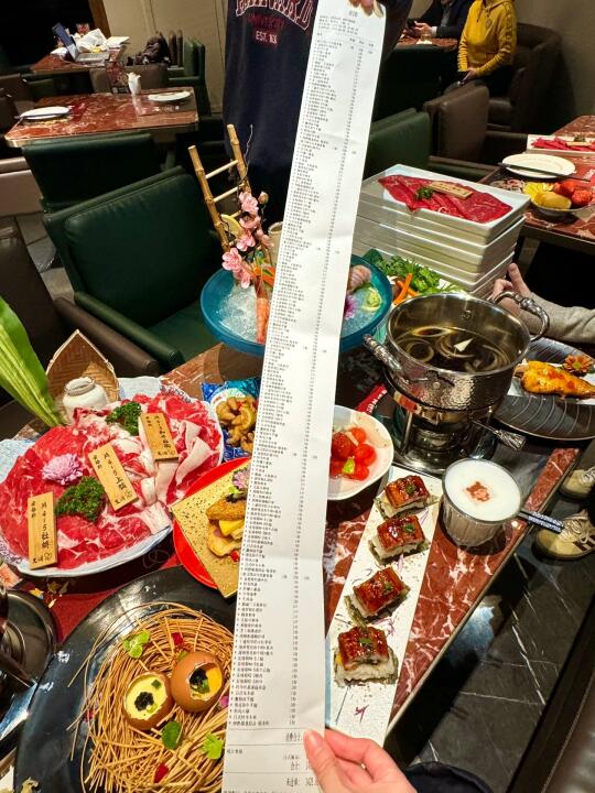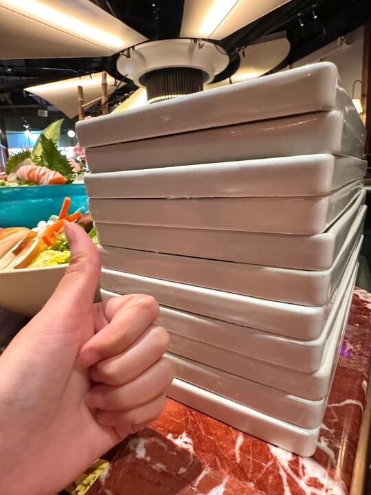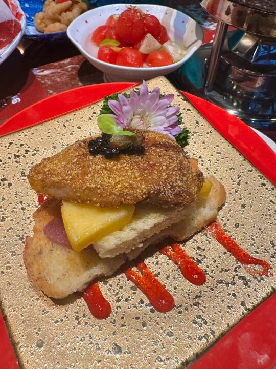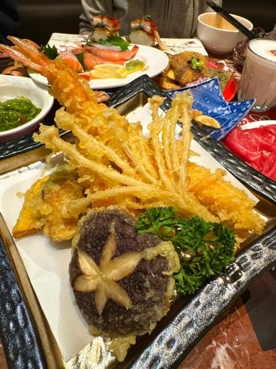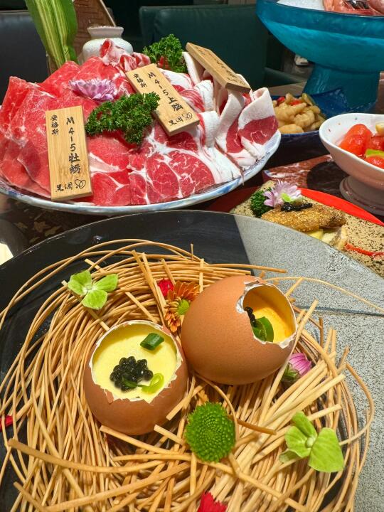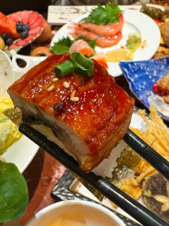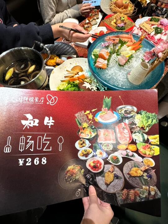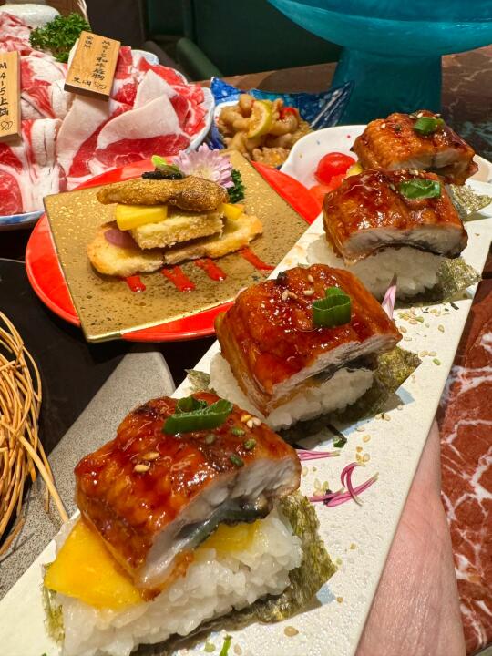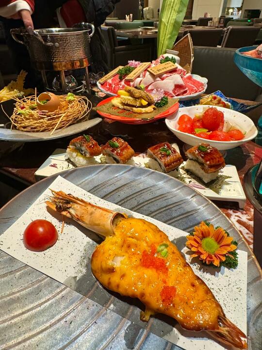榴莲包、寿喜烧、和牛、寿司、鹅肝、刺身、天妇罗 甜品慕斯蛋糕 、水果居然有蓝莓……还有芝士焗黑虎虾个头贼大,吃爽了